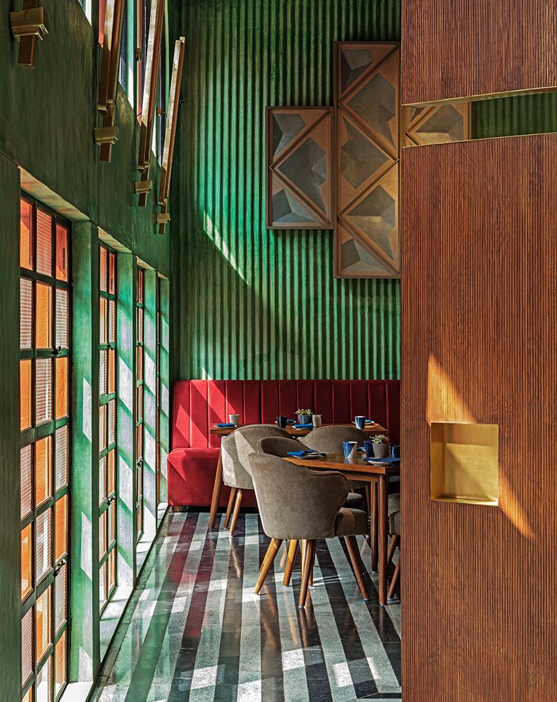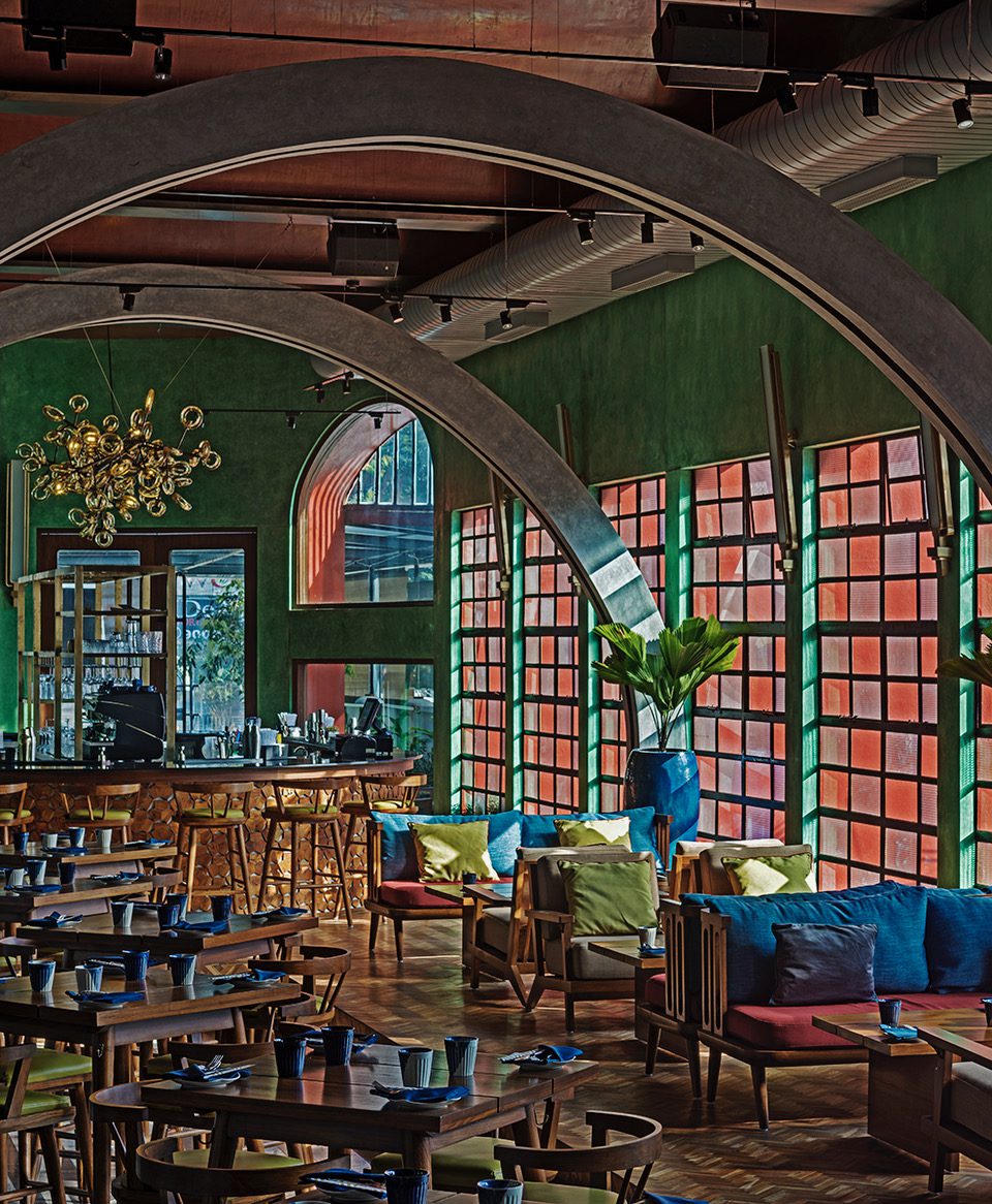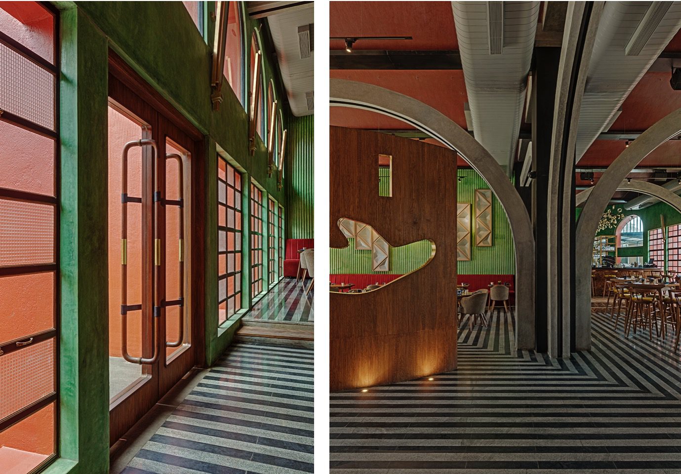 The design moves that ensued were an imagined contemporary interpretation of a grand bye-gone era mixed with contextual influences. The 20ft high ceilings of the space were treated with a series of repetitive vaulted arches and rendered in a red-oxide finish. Accent walls were cast in corrugated cement with a green oxide pigment. The flooring design was created with a bold and alternating striking linear pattern of local grey sadharhalli granite and black cuduppah stone. Columns were clad in sheets of Mild steel and then lacquered.