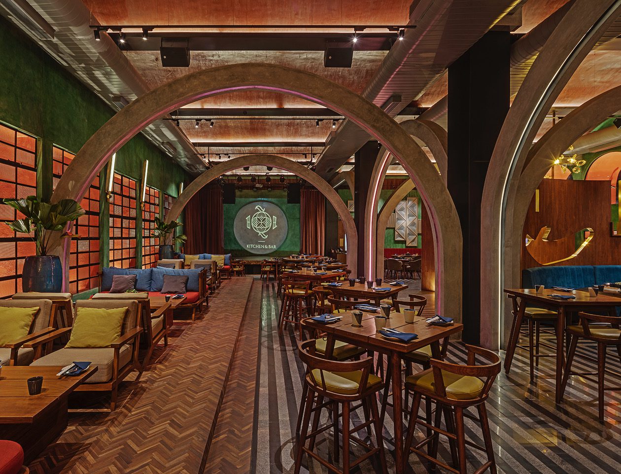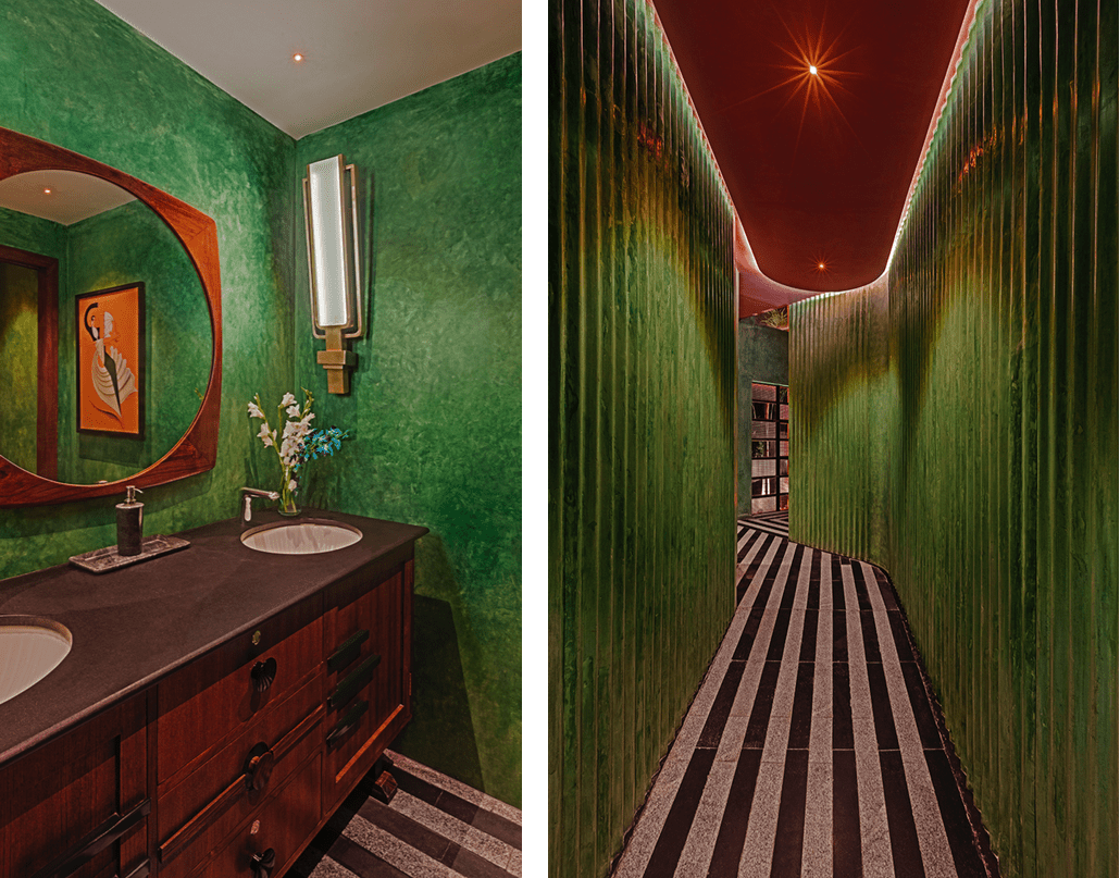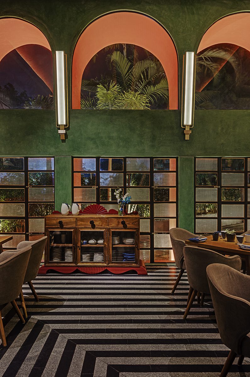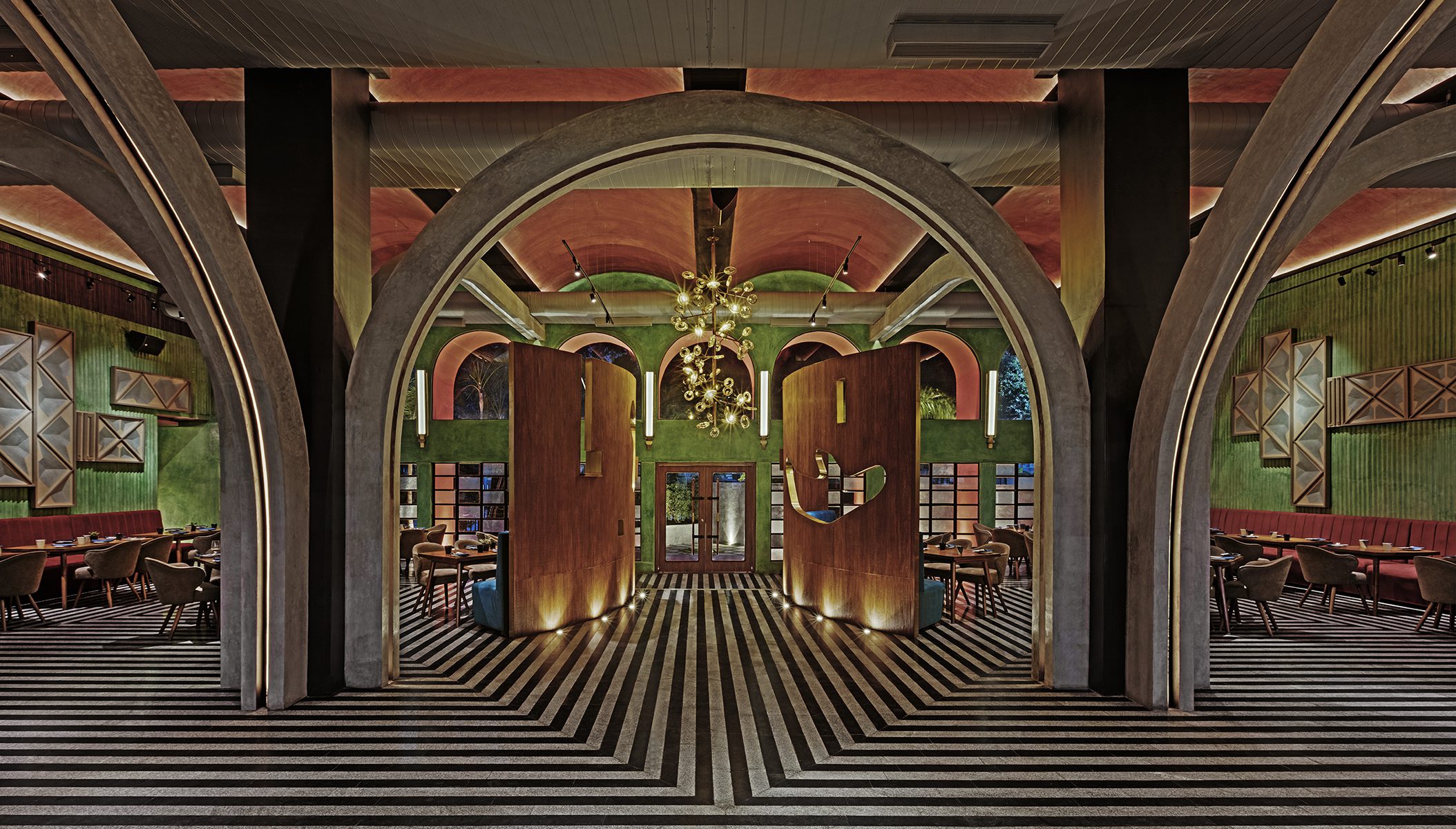 The design moves that ensued were an imagined contemporary interpretation of a grand bye-gone era mixed with contextual influences. The 20ft high ceilings of the space were treated with a series of repetitive vaulted arches and rendered in a red-oxide finish. Accent walls were cast in corrugated cement with a green oxide pigment. The flooring design was created with a bold and alternating striking linear pattern of local grey sadharhalli granite and black cuduppah stone. Columns were clad in sheets of Mild steel and then lacquered.