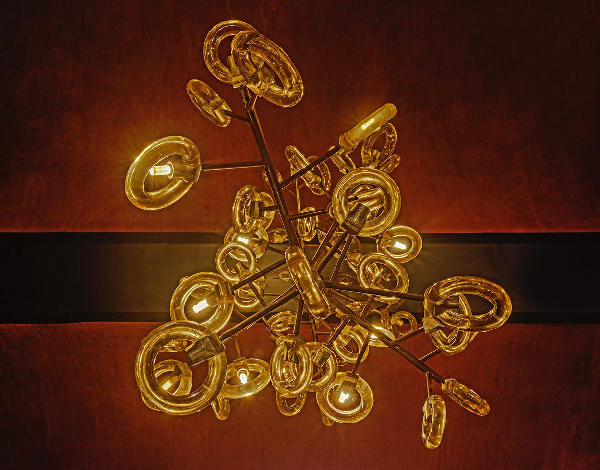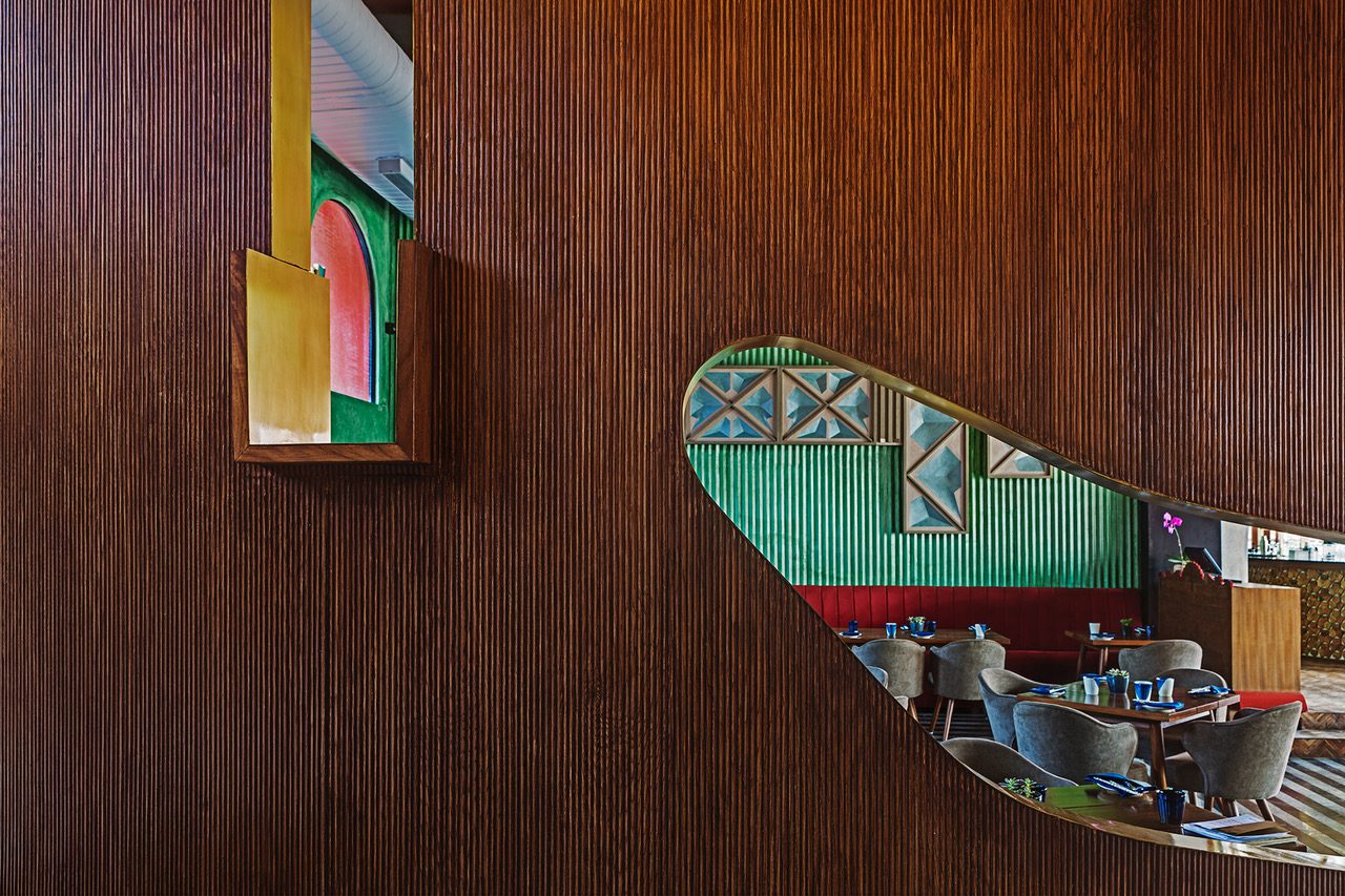 Other highlights in the space are the imposing custom designed chandeliers that we created in the entrance as well as over the bar counter. The chandeliers were inspired by the branches of trees bearing fruit and are hand crafted with Mild steel pipes with ends fabricated in rings of amber coloured resin. Large frieze artworks on each of the restaurant walls recall the zigzag and ziggurat pattern influences of the Art Deco era. Additional Deco inspired linear light scones were designed by us in brass and fluted glass to emphasize the verticality of the interior.