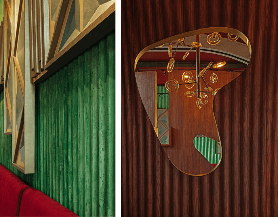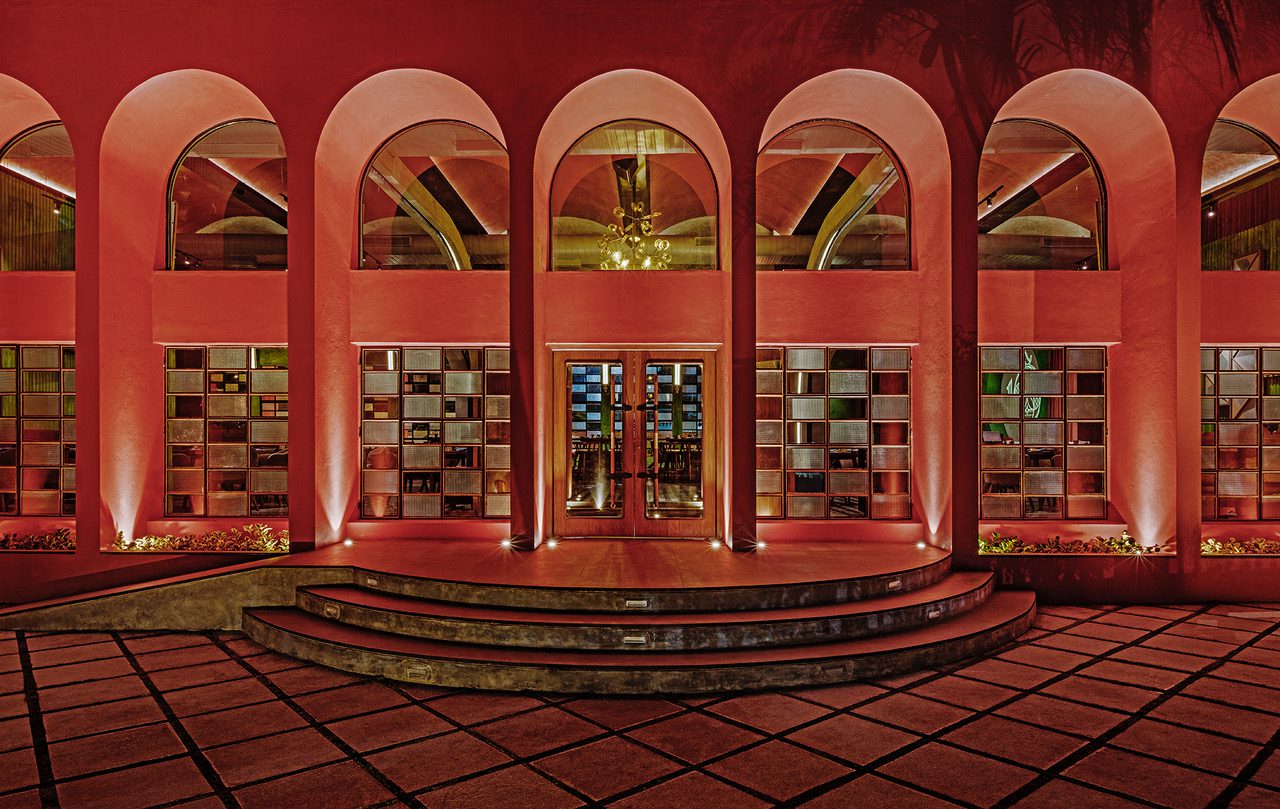 The spatial flow is via a hardscaped entrance courtyard peppered with palm trees. On entry are two symmetrical curved mid-century timber and brass screens that create an intimate entrance foyer. On either side are two bays of restaurant seating. Perpendicular to the axis of the entry and foyer is a linear bay with a large Island bar on one end and a stage for live music performances on the other. The space between is interspersed with high seating on the ground level and low lounge seating on a raised wooden platform.