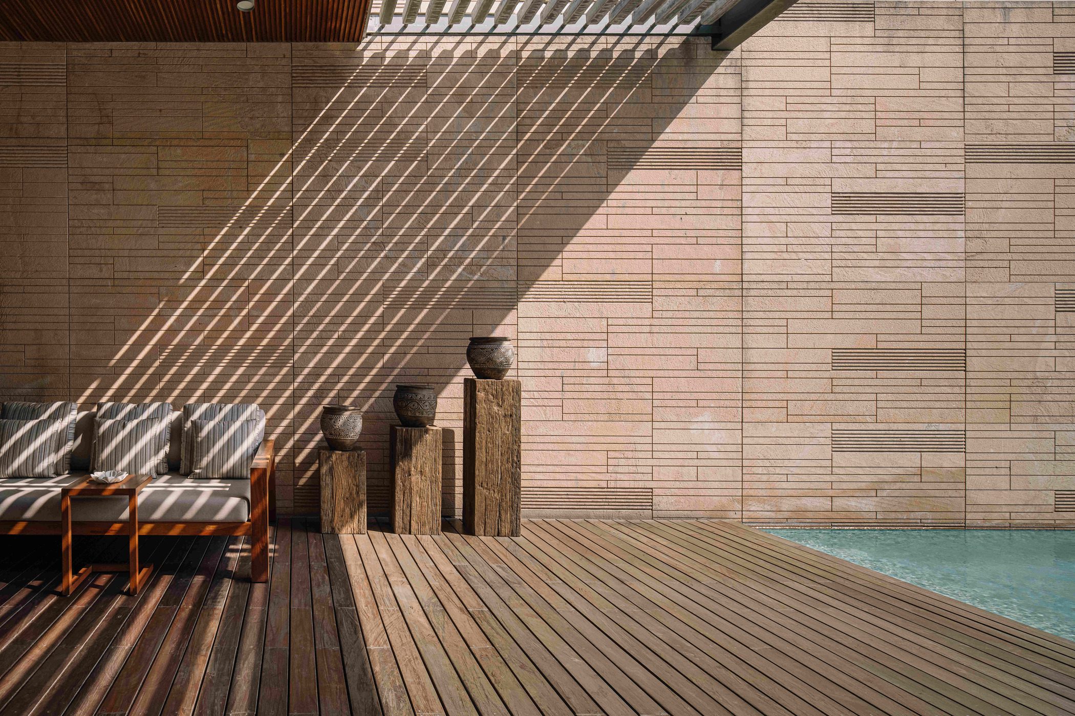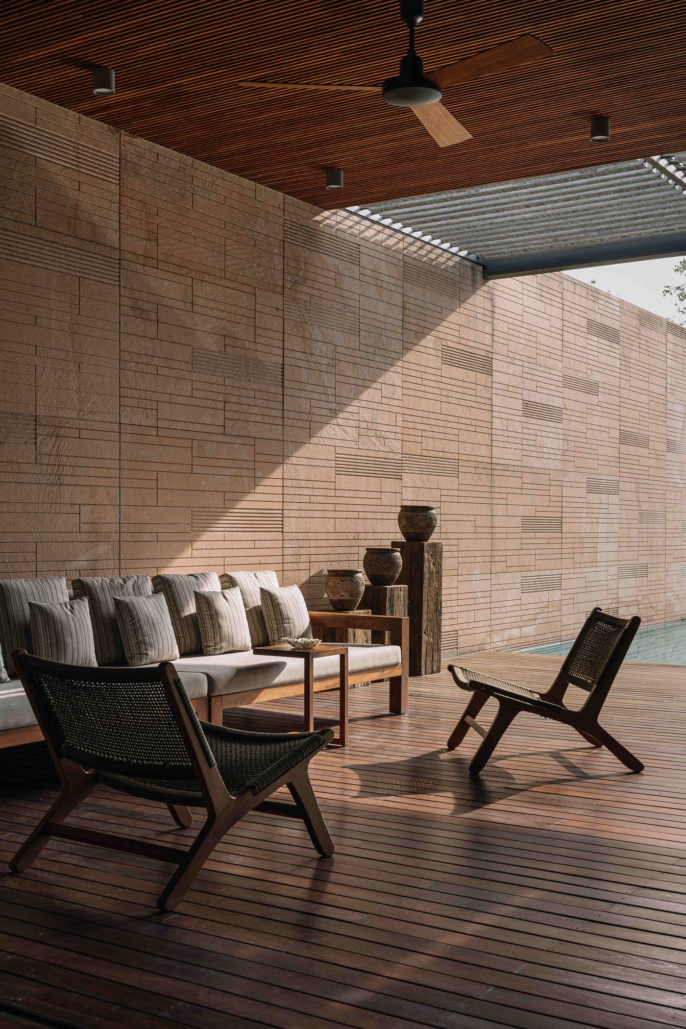 We oriented the double height living space to have permeable and shaded verandahs on its east and west to take advantage of the outdoors, the morning and evening light as well as east to west breezes. The east verandah faces an intimate pool-court while its counterpart on the west overlooks an abundance of landscaped green. Two existing old neem trees were accommodated in the building design to enhance shade in the west. The north wall of these verandahs are clad in a grooved and patterned pink sandstone and witness an ever changing play of sciagraphy on their surface throughout the day.