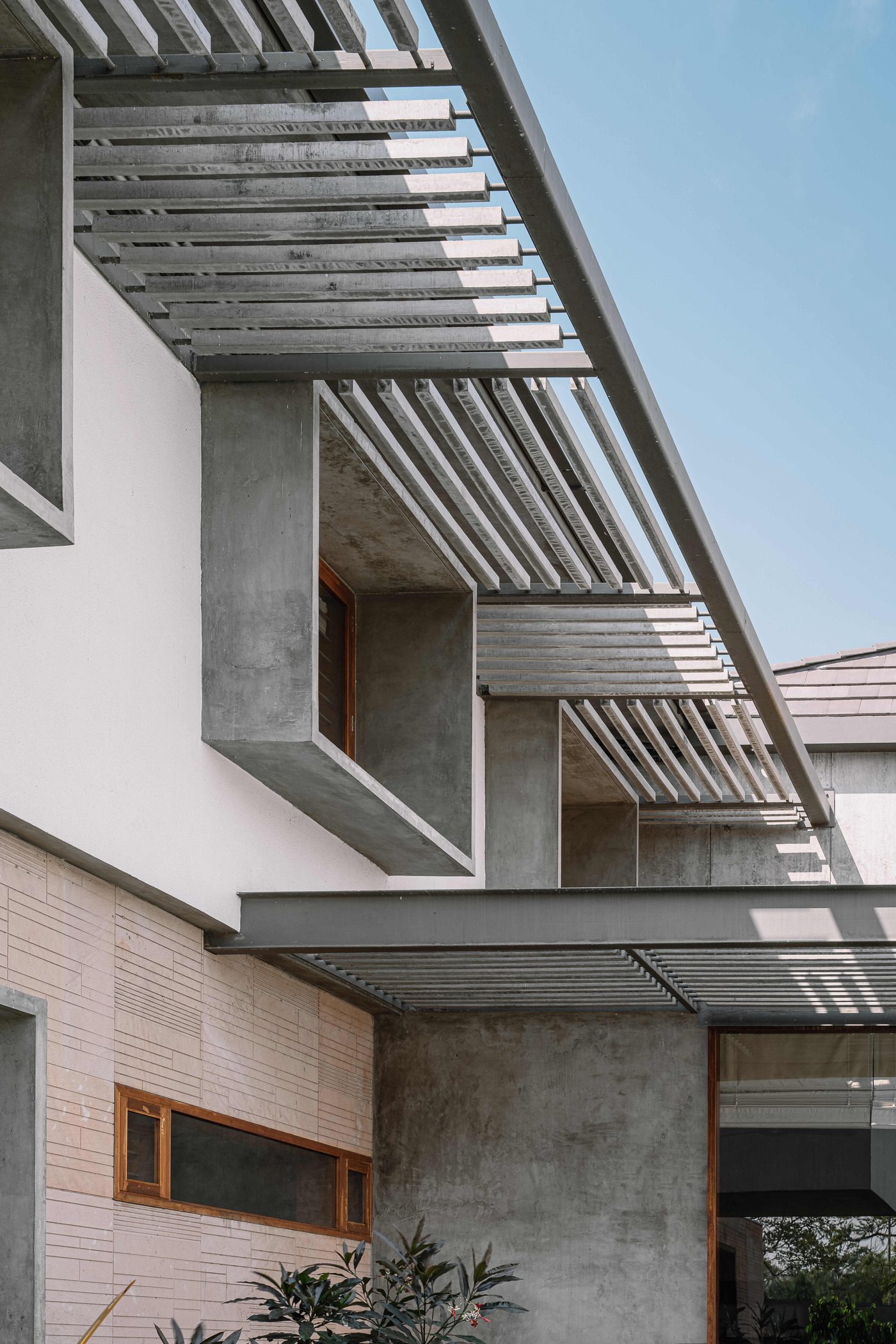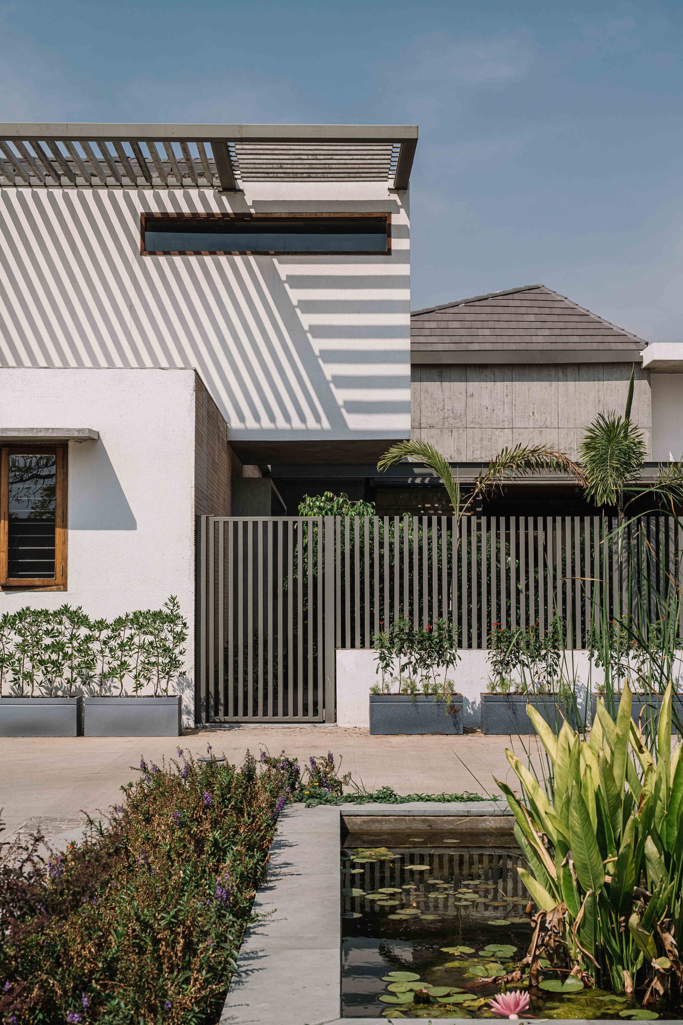 The form of the house is derived from its climatic orientation as well as shading devices that keep the internal spaces cool. Deep verandahs and overhangs, horizontal pergolas and vertical louvers gently filter the fierce sun. Strategically placed apertures promote cross ventilation, while reducing heat gain.