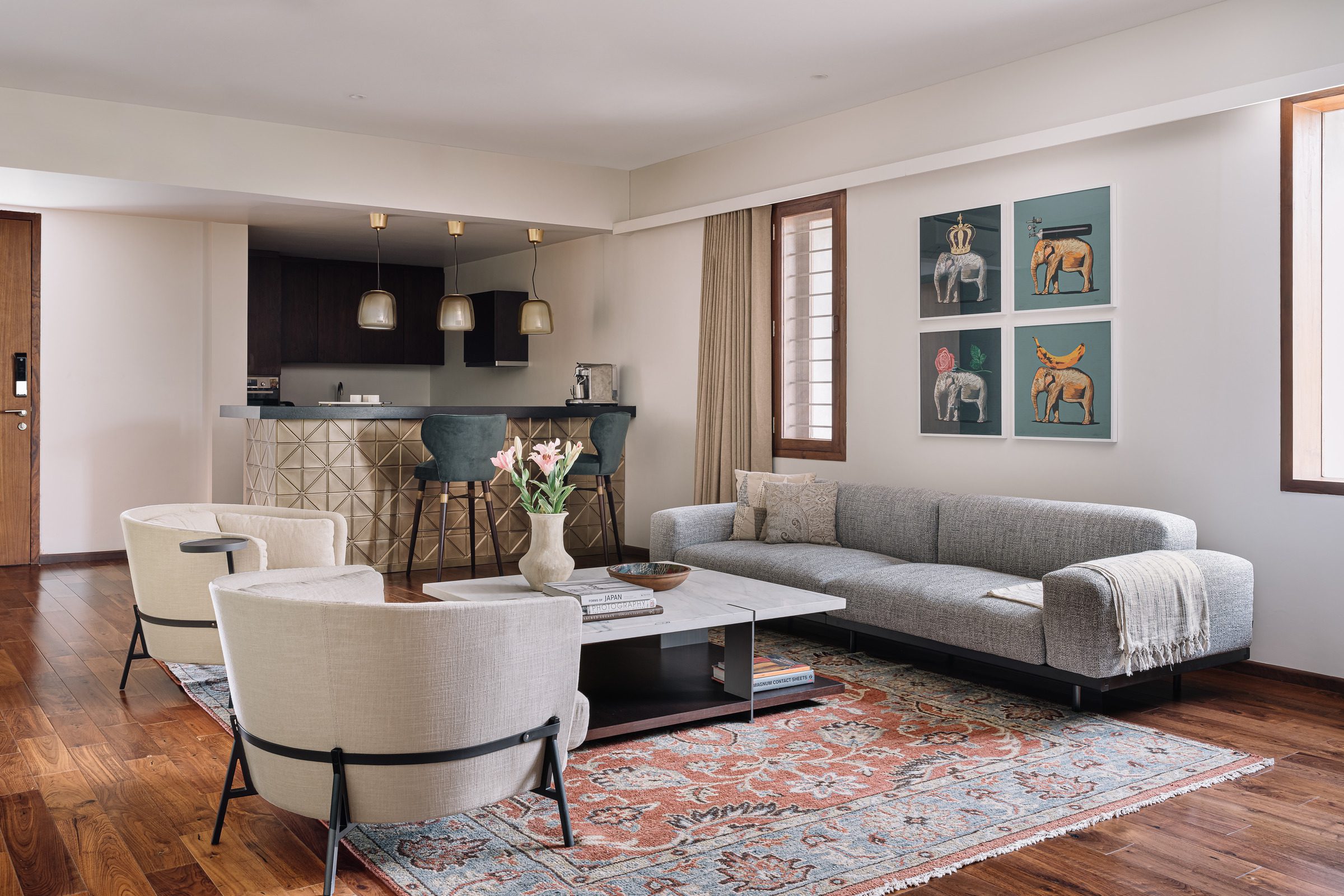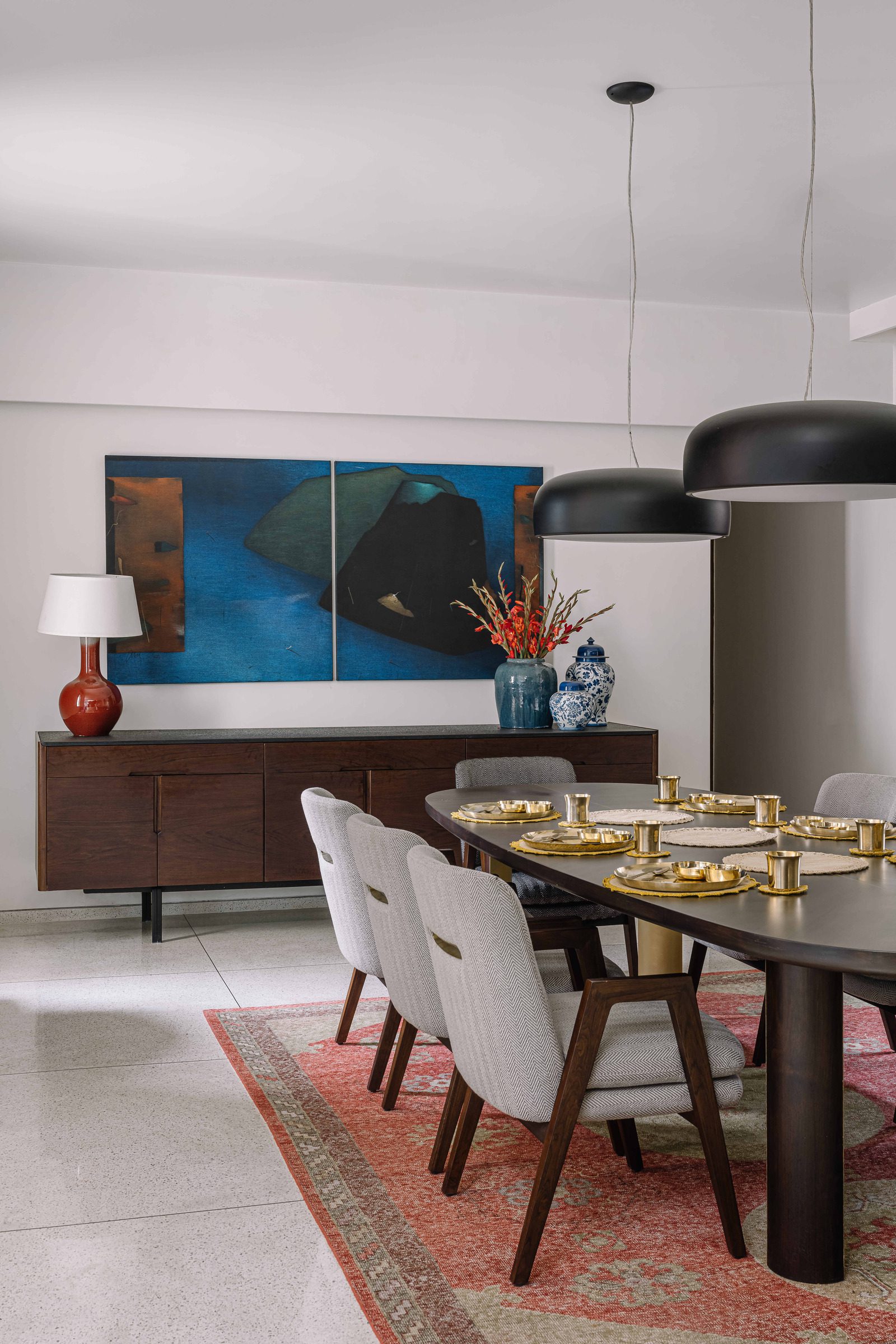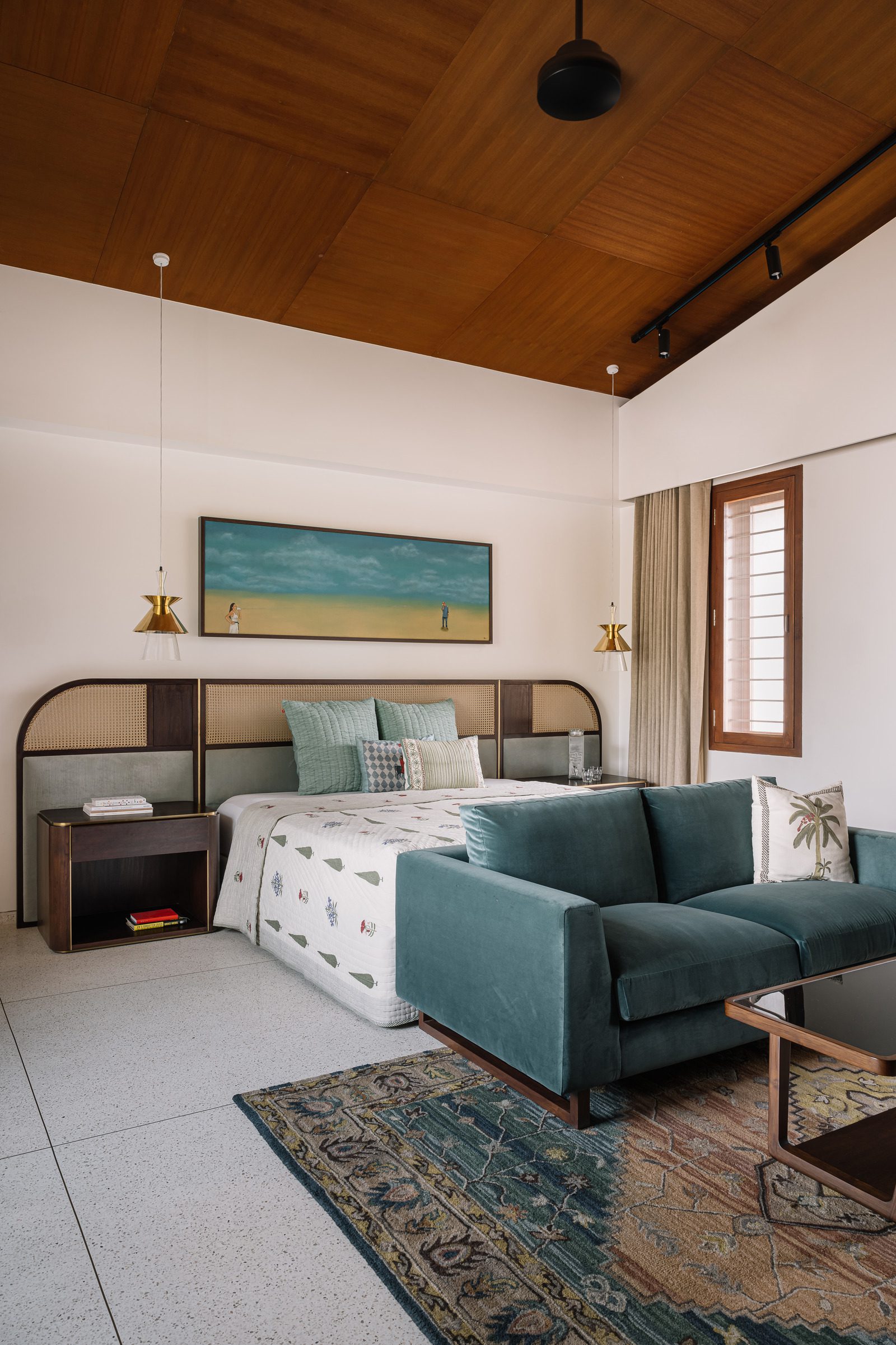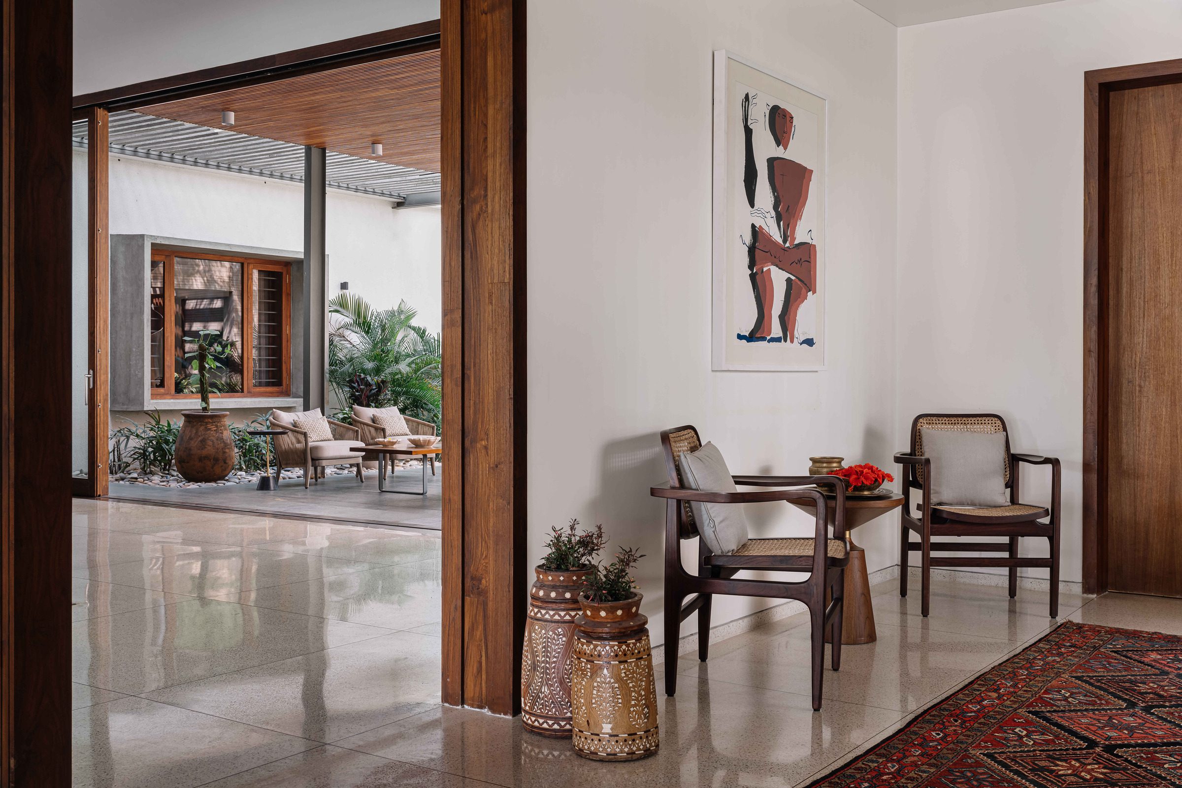 The interior sensibility has a soft and muted colour palette of aquas blues, beiges and blush. The chosen pieces of furniture were mostly custom designed by us in collaboration with Mangrove Collective. Contemporary Indian Art, tribal sculpture, Jain Pichwais and traditional rugs adorn the spaces, and a quintessential Gujarati swing takes centre stage in the verandah.