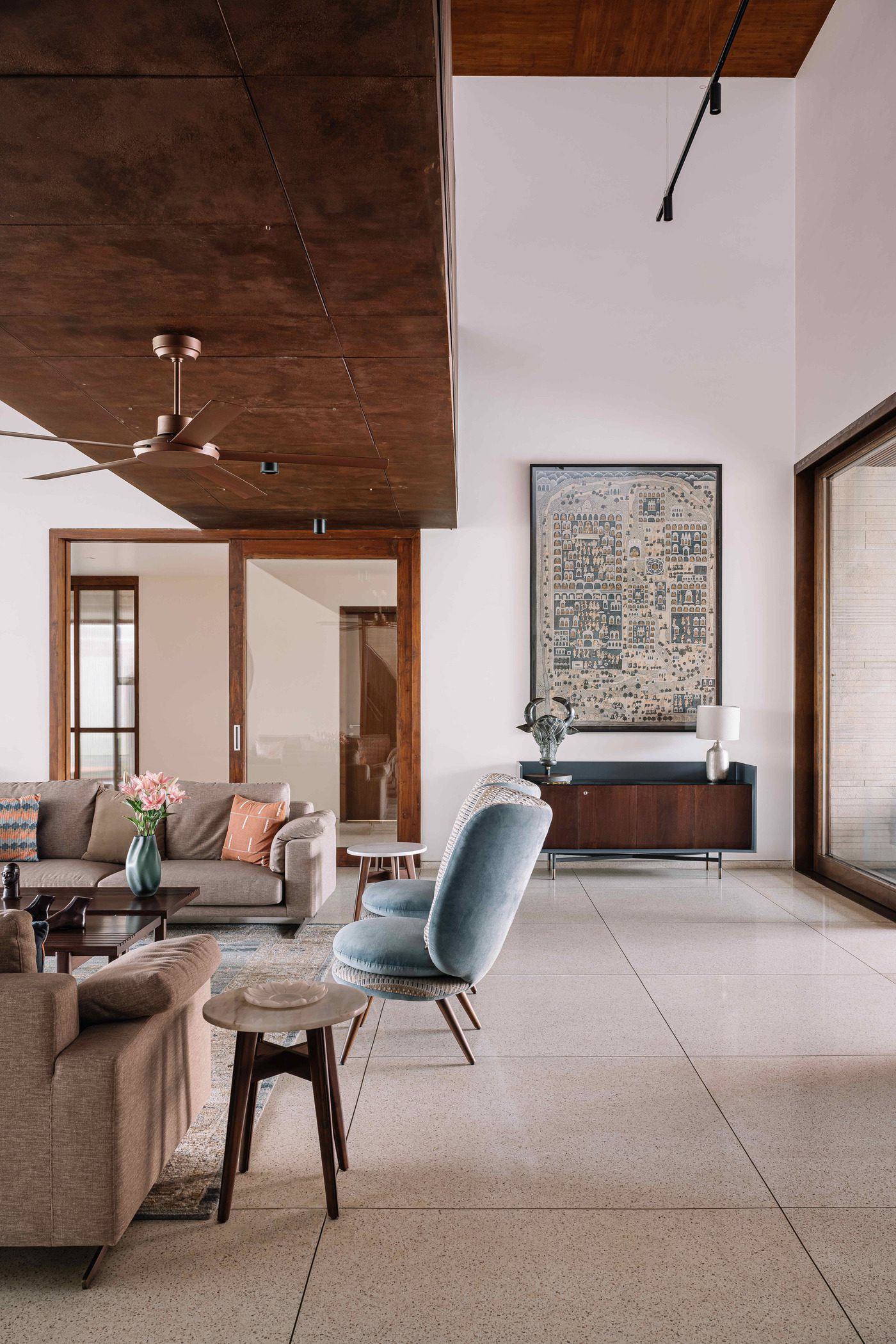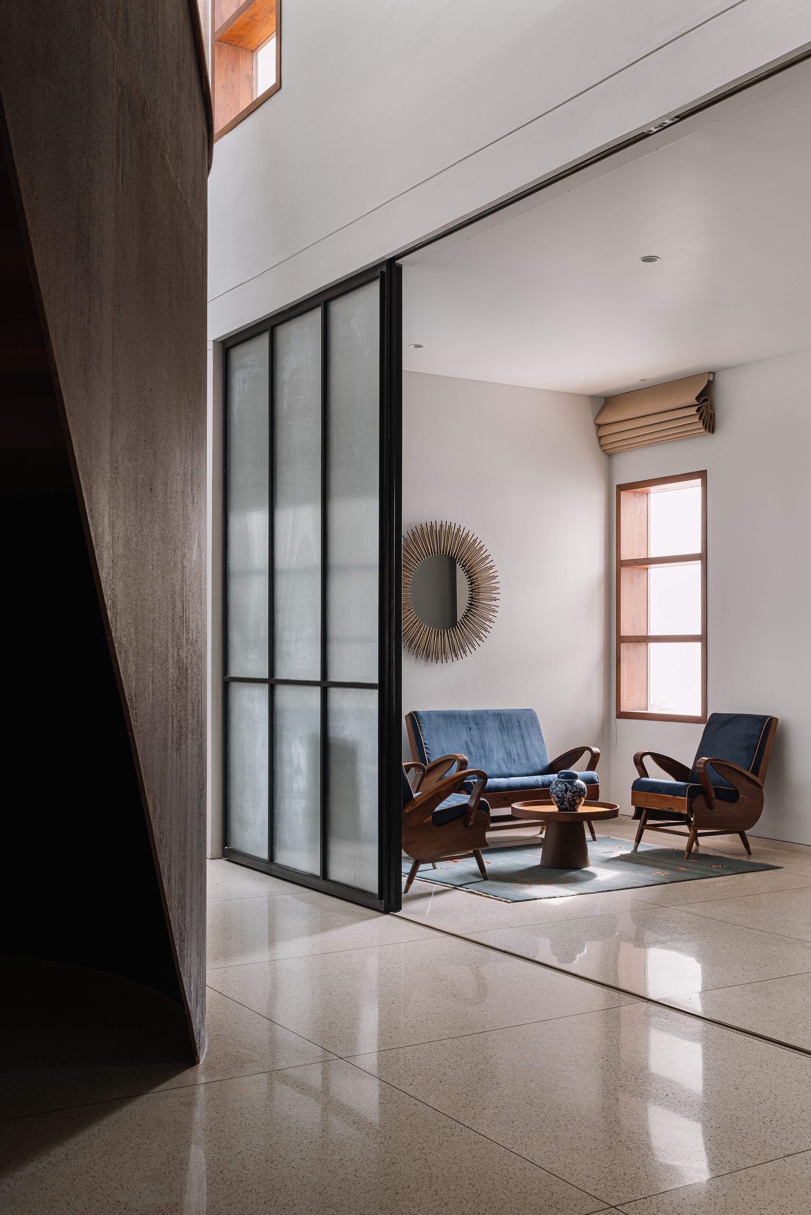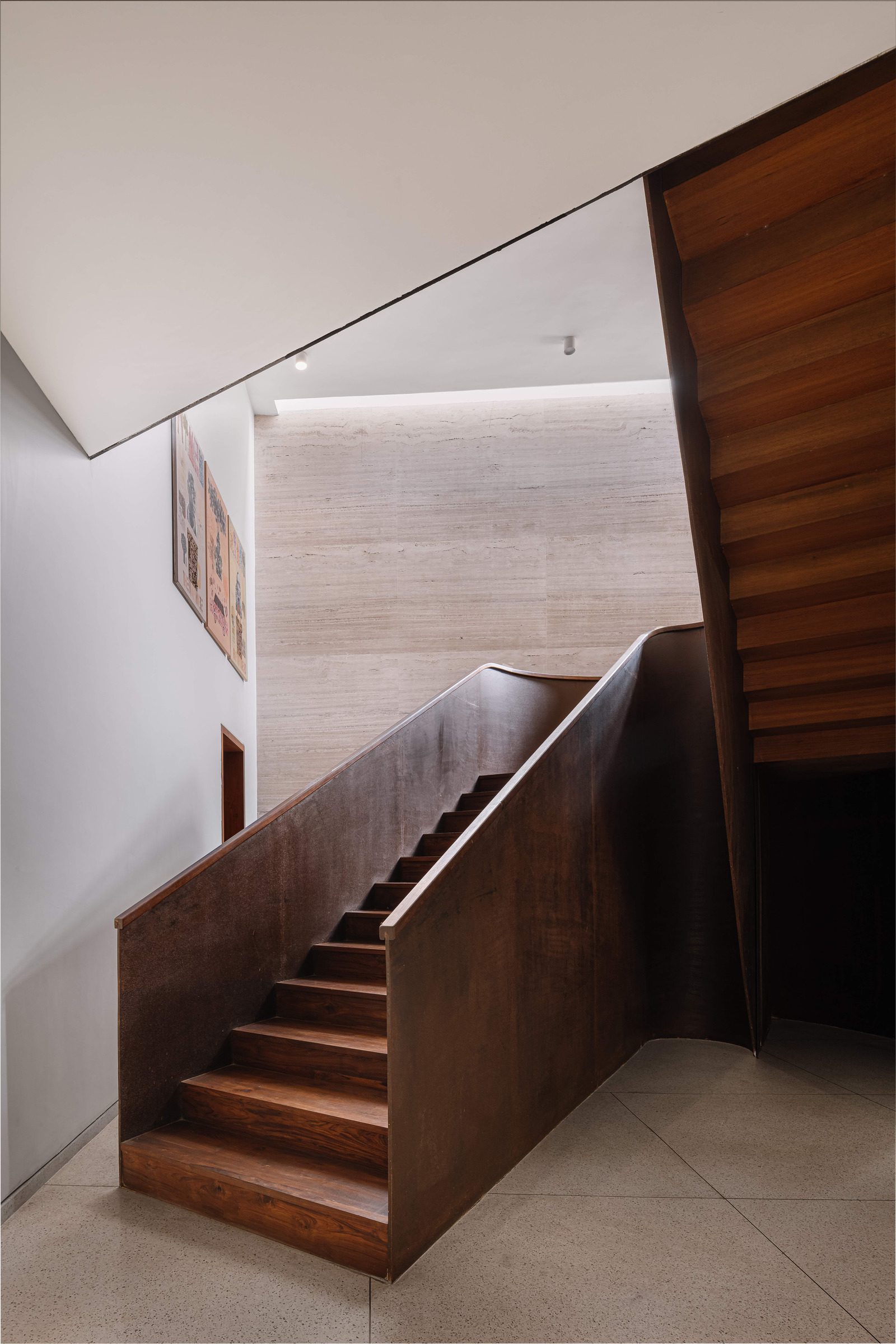 There are three trapezoidal roofs that envelope the double height living room as well as the upper level bedrooms. The one above the living space admits a soft quality of north light into its volume. The roofs are clad on their underside with the warmth of wood veneer and contrast with the cool beige terrazzo floors that extend through the home.