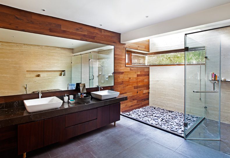 The view of the exterior reveals ceilings clad in timber, with horizontal louvers to block the glare, and walls clad in a soft grey stone. A planter box holding palms wraps around this space, providing a sense of enclosure and an oasis of calm.