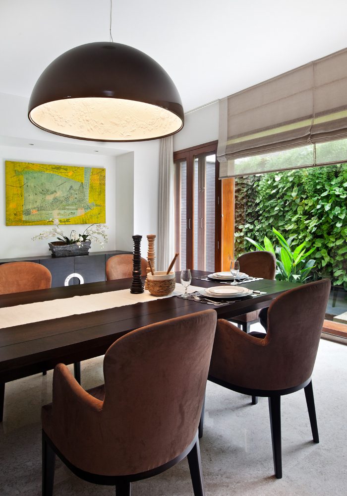 On the ground floor, space flows seamlessly between the foyer, living and dining areas. The open plan extends into the setbacks and also facilitates cross ventilation. The dining has a large picture window looking out into linear green wall and the living gets respite from a lung space on the southeast corner where we saved on the only old tree on the site.