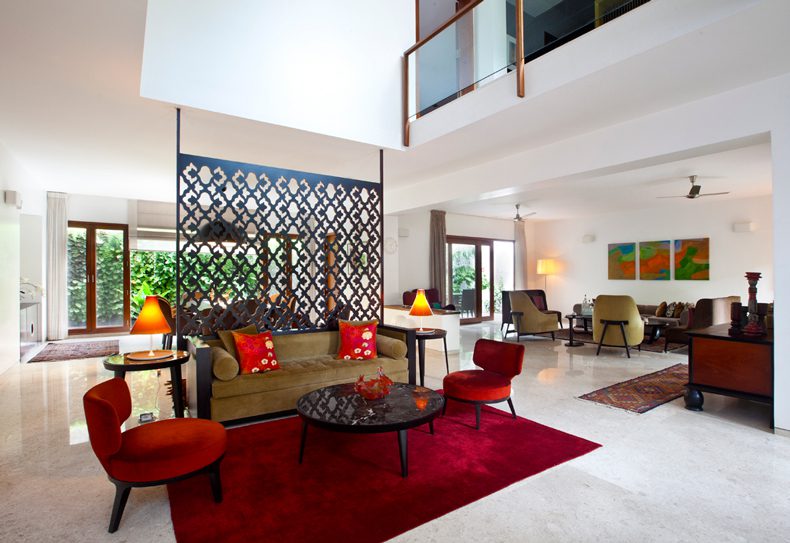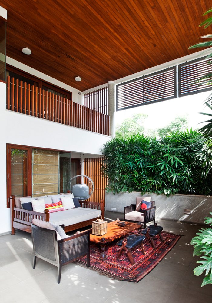 We didn’t want the building to look like an apartment block. So the three floors are connected through two double height spaces, one internal and the other on a terrace. These double height spaces serve as connectors between the floors and permit interaction, so that the occupants are never divorced from the floor below. Moreover, of necessity, the house is inward looking, since the plot is located in the middle of a bustling business district.