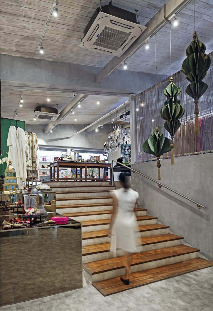 The upper floor is an airy space on two split-levels focusing on apparel and accessories. One of the highlights of the space is a screen of vertical jute that gently demarcates both levels. At the far end is the display of spa products set against a white brick wall and bathed gently with natural light via a skylight.