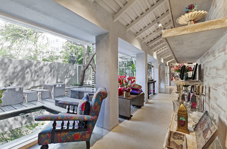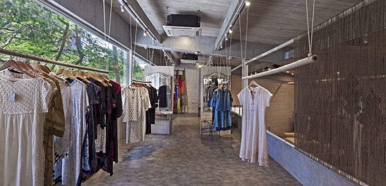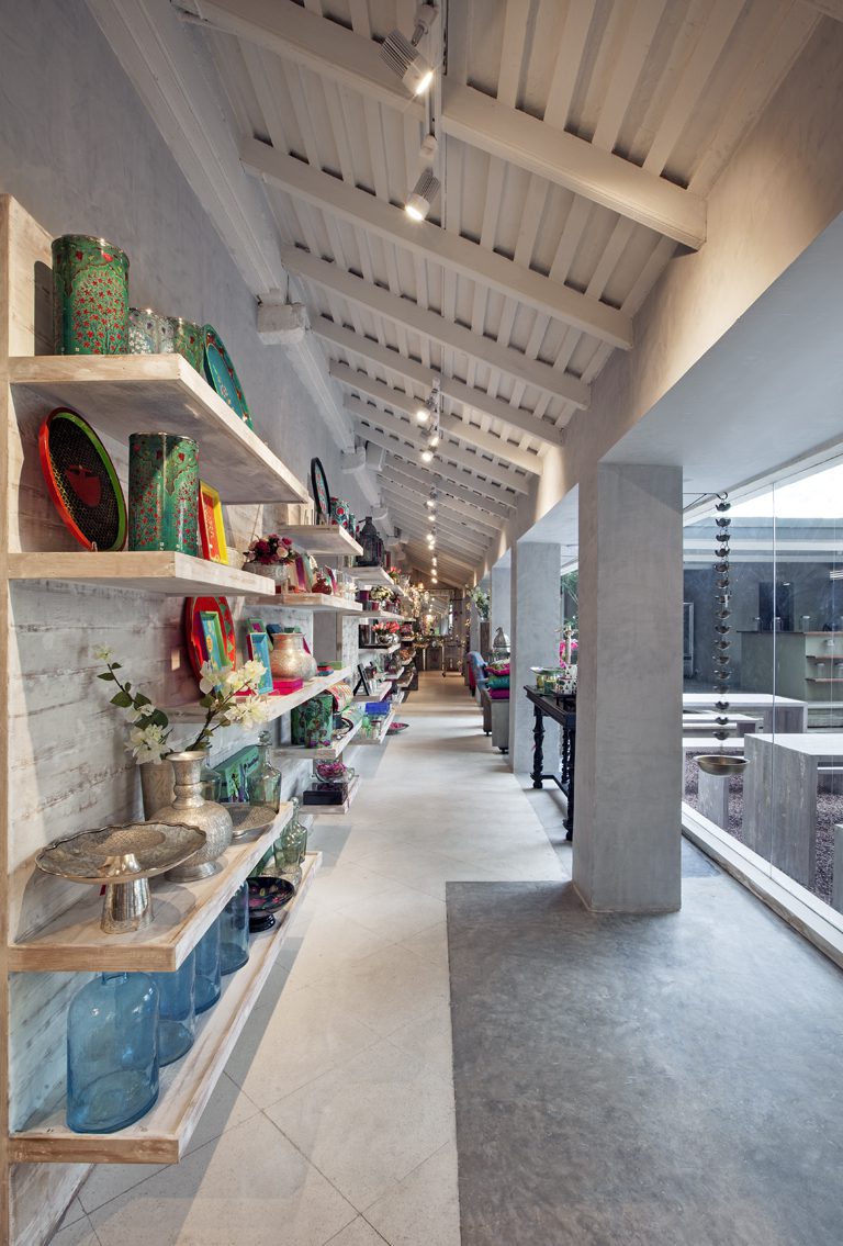 The site, located in Bangalore’s’ most fashionable shopping district features an open-to –sky courtyard at its entrance. We intervened by inserting a covered pavilion and a verandah at its two ends; one accommodates an organic juice and salad bar/cafe while the other acts as a generous entry to the store and a connector between its two levels