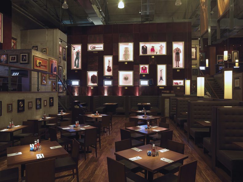 Two dramatic double height walls, clad in a sumptuous streaked purple velvet sport backlit niches of varying sizes that house the precious memorabilia that Hard Rock is famous for.