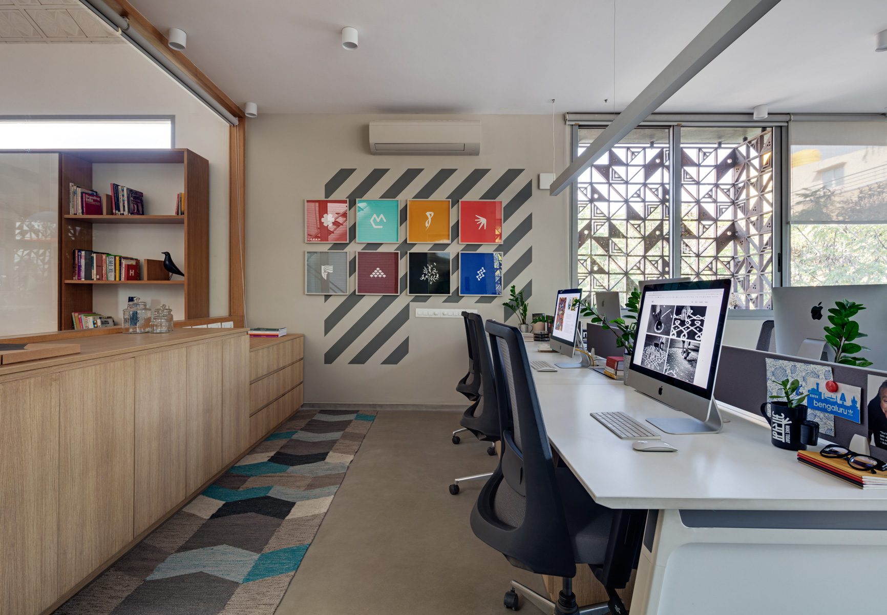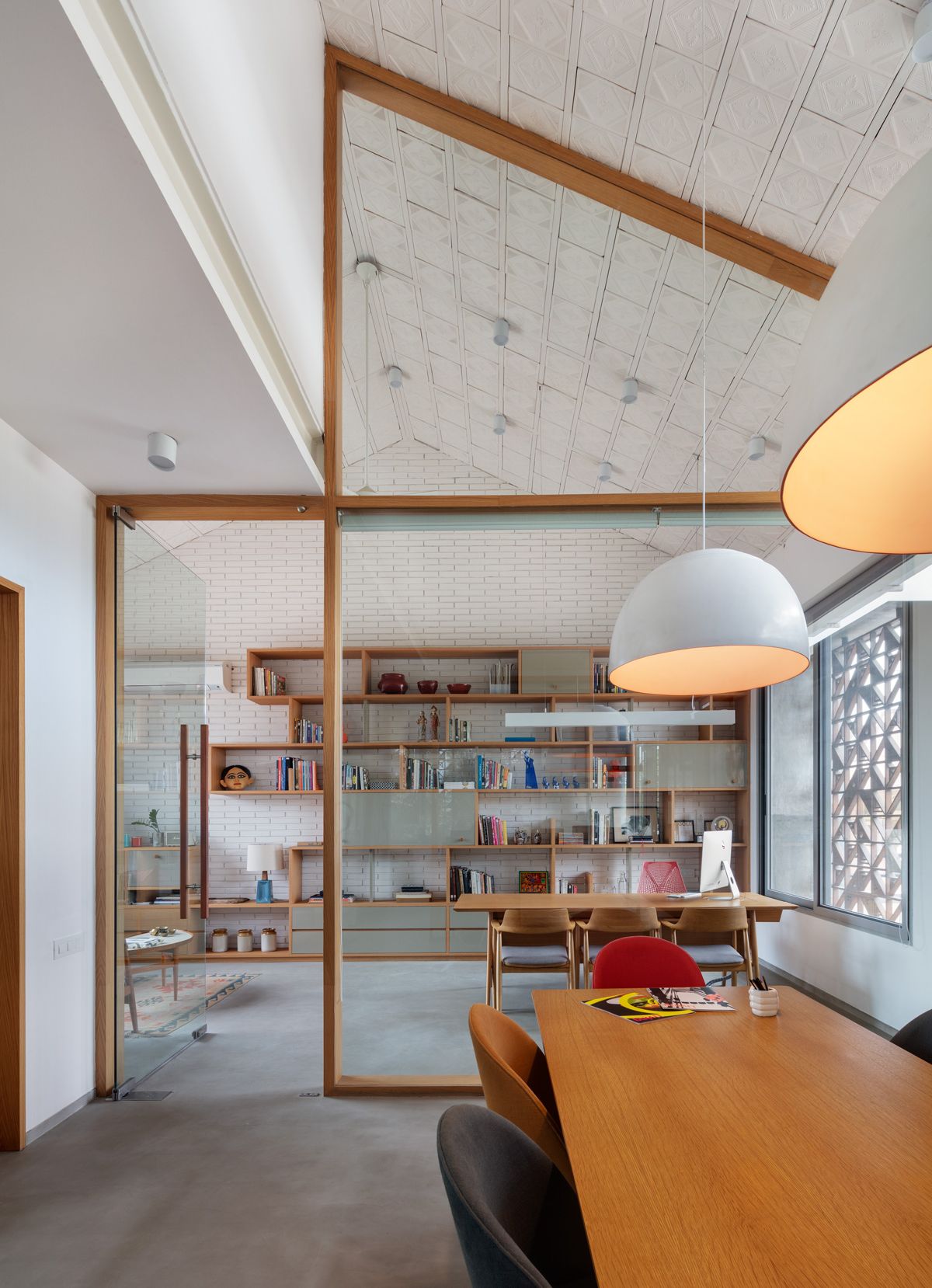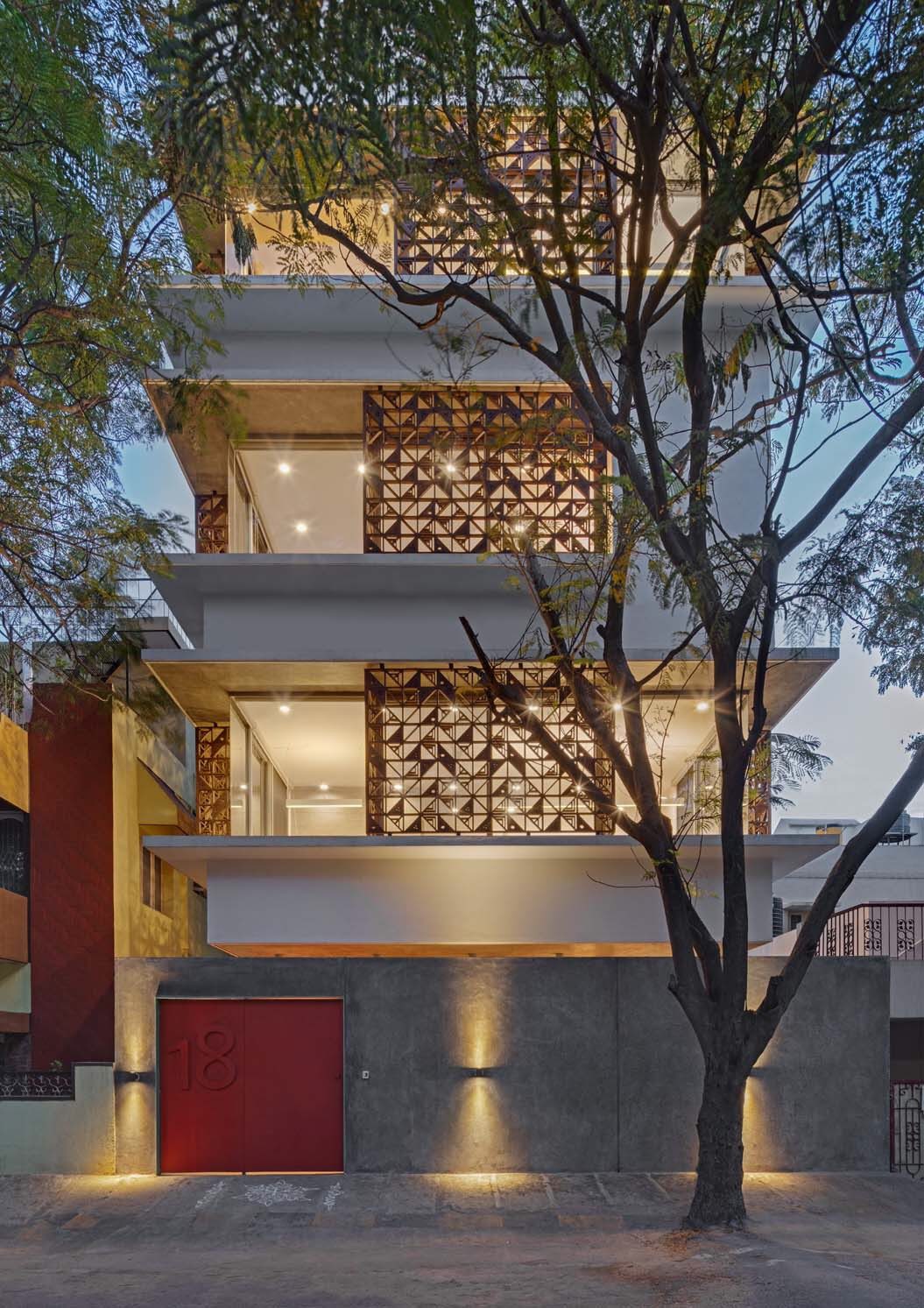 An exterior 2ft Wrap-around overhang shelters the windows from sun and rain on each level. We devised a system of wooden box jaali screens to protect the openable windows. The pattern of the jaali was derived from the whimsical “DashDashDot” series of Terrazzo tiles that Sandeep and Tania designed for Bharat Floorings, also used as an arresting vertical backdrop for the studio reception. The wooden jaalis provide for daylight filtering during the day, screen certain undesirable views, allow for cross ventilation, provide a layer of security to the building while providing playful patterns in the interior space through the day.