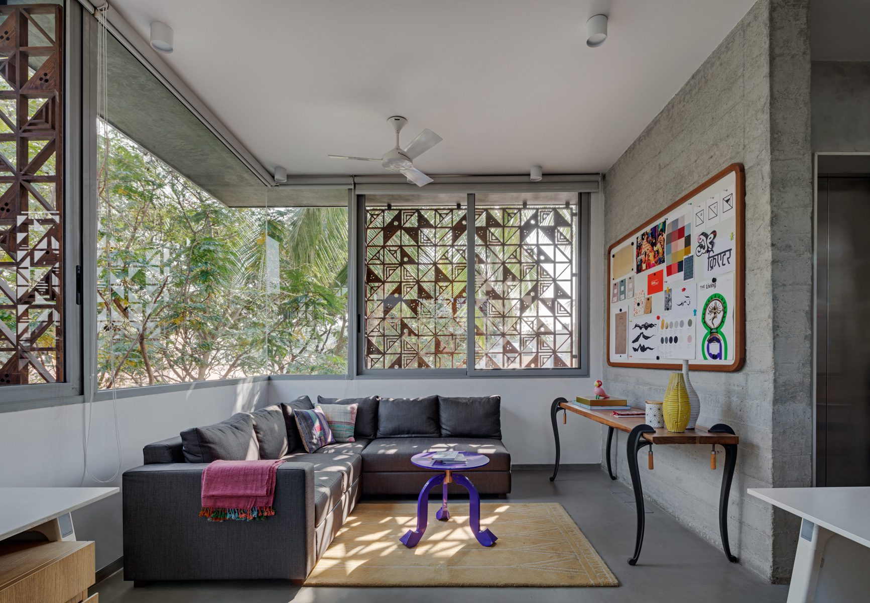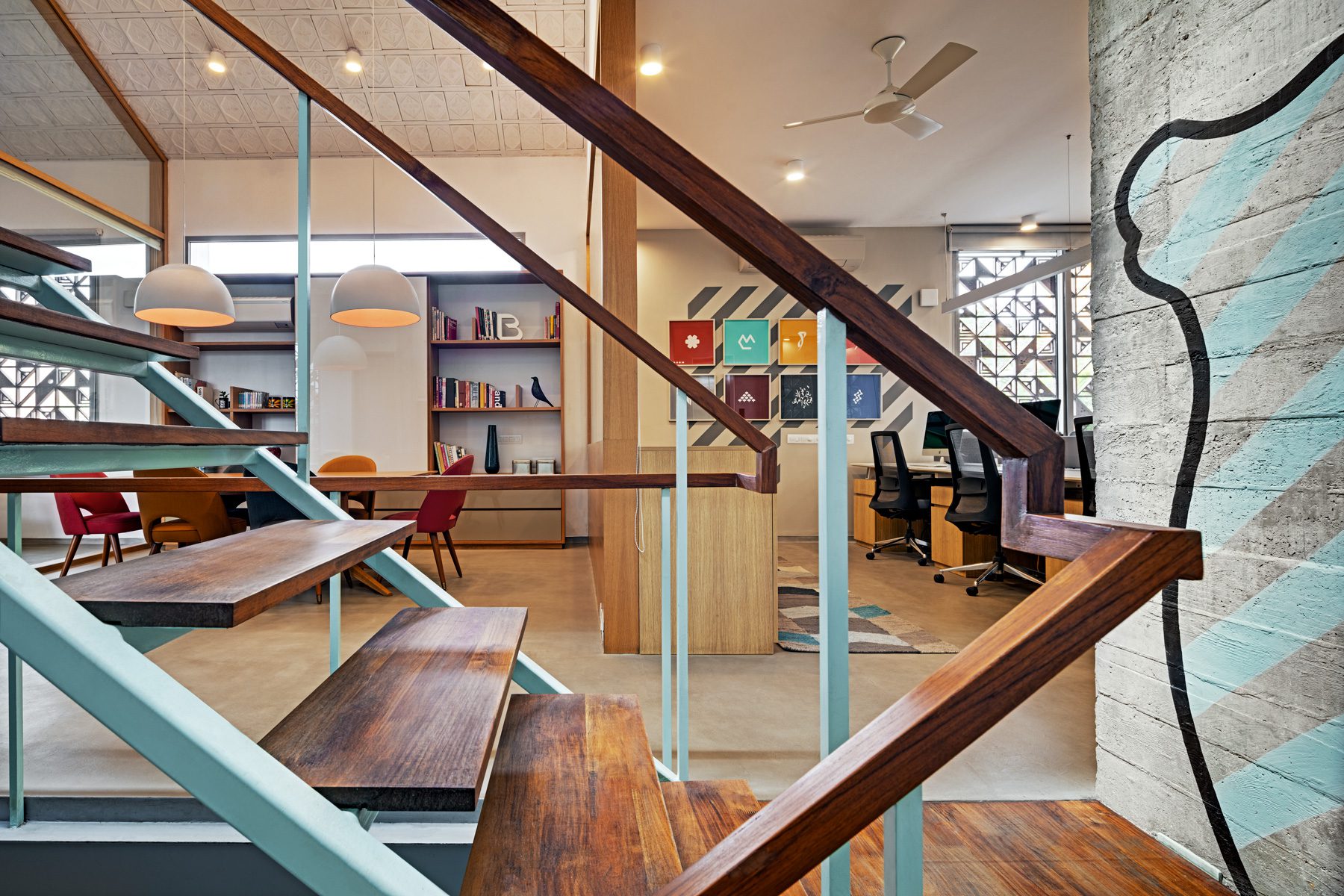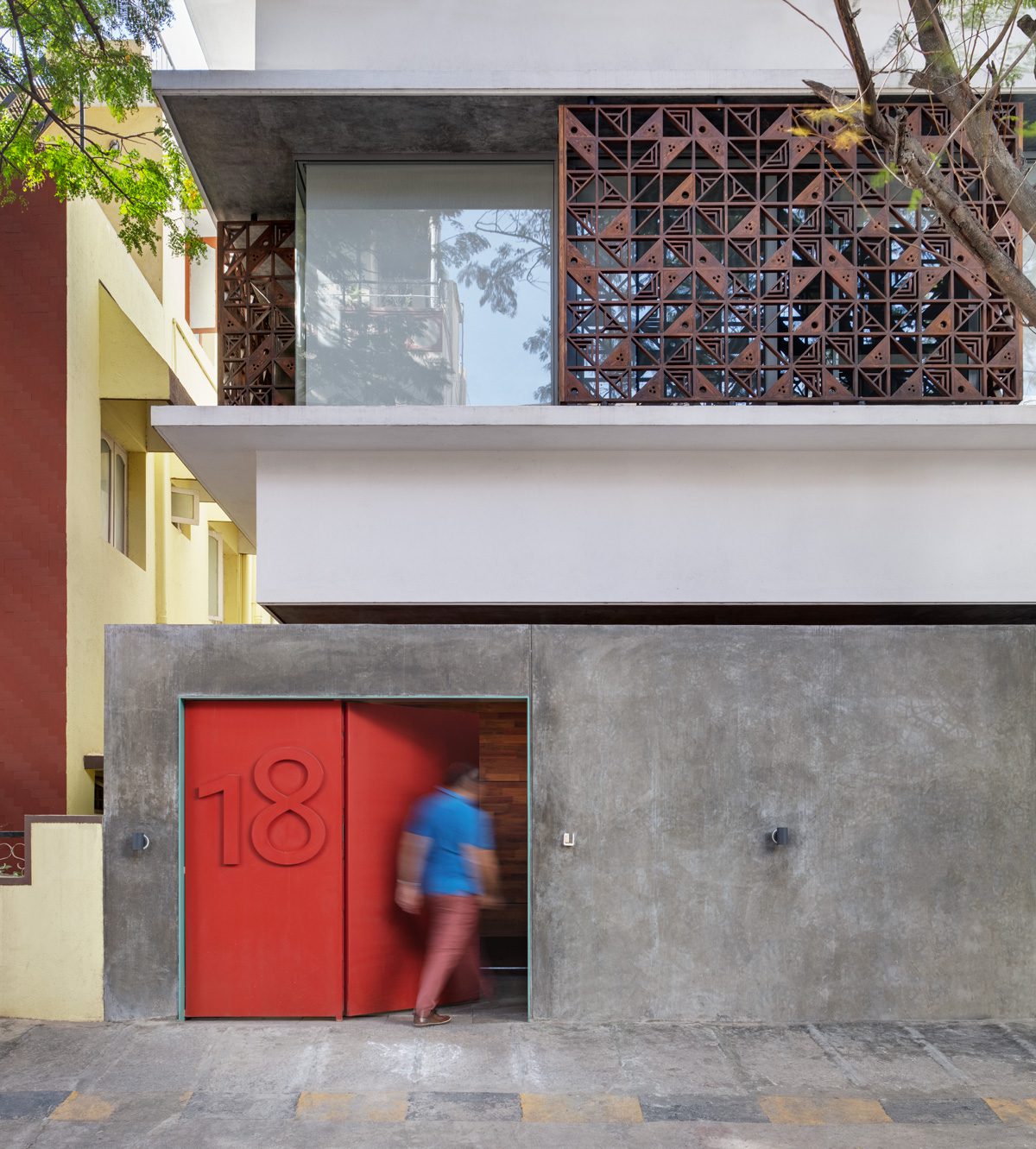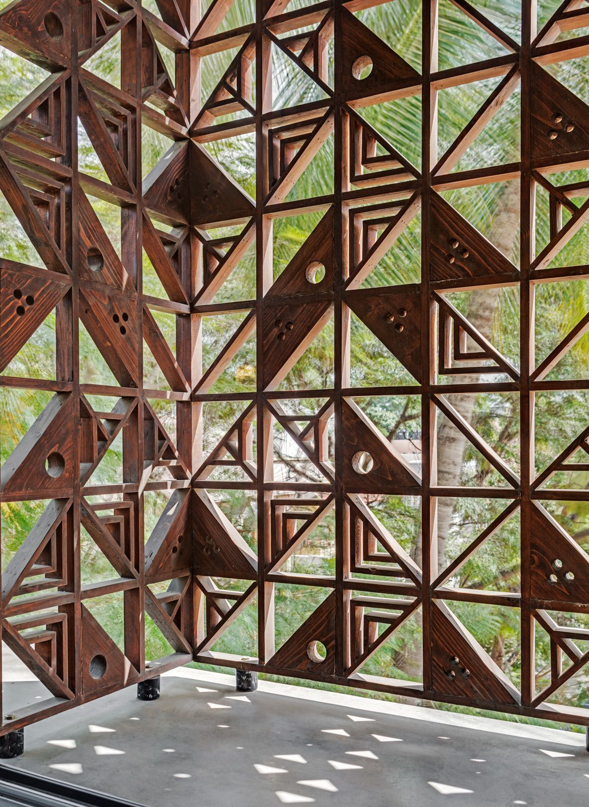 An exterior 2ft Wrap-around overhang shelters the windows from sun and rain on each level. We devised a system of wooden box jaali screens to protect the openable windows. The pattern of the jaali was derived from the whimsical “DashDashDot” series of Terrazzo tiles that Sandeep and Tania designed for Bharat Floorings, also used as an arresting vertical backdrop for the studio reception. The wooden jaalis provide for daylight filtering during the day, screen certain undesirable views, allow for cross ventilation, provide a layer of security to the building while providing playful patterns in the interior space through the day.