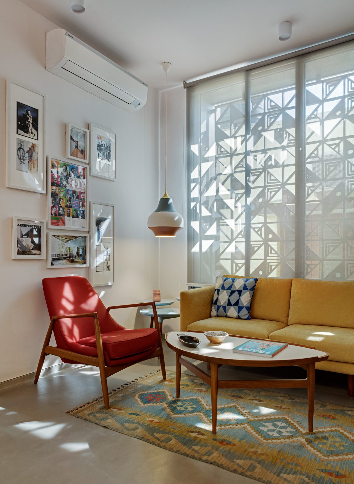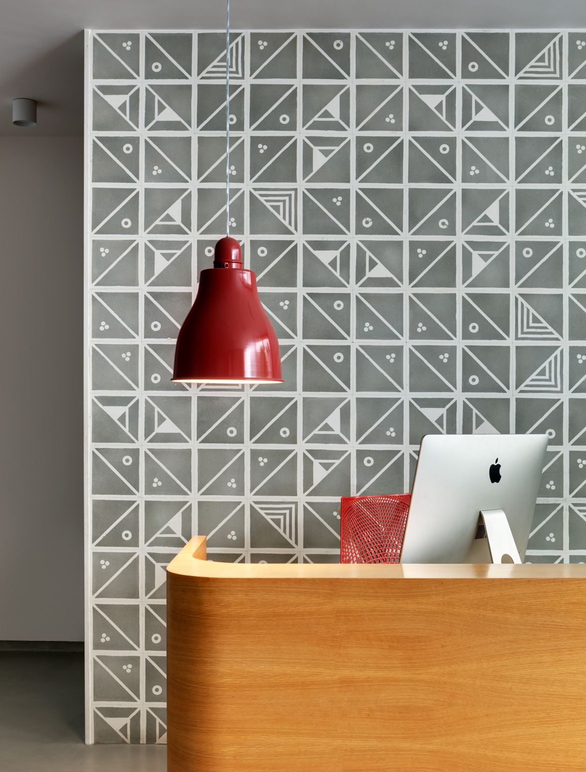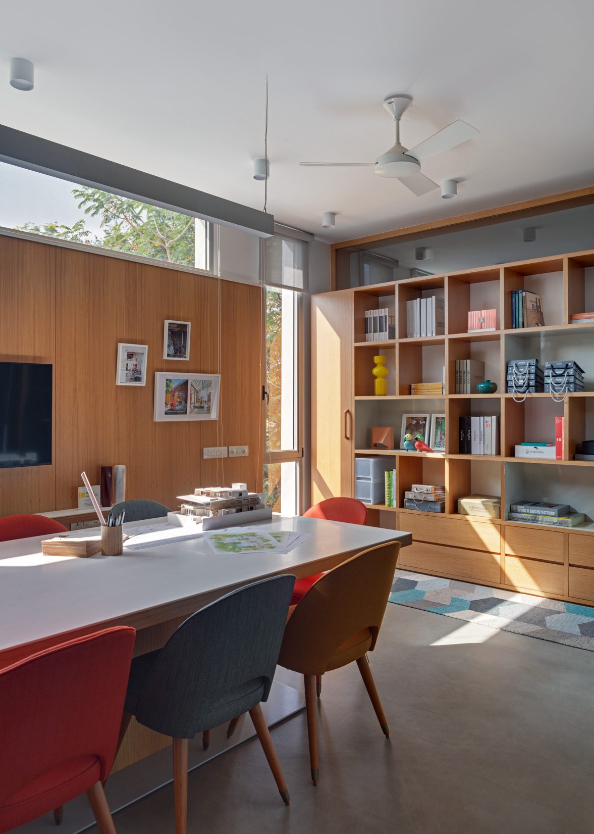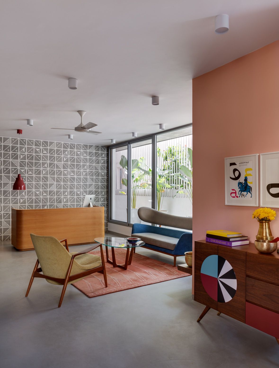 The materiality of the studio is textural while staying fairly monochromatic. There is a combination of brick walls and Kerala roofing tiles painted white, form finished concrete, screed cement flooring and patterned terrazzo. Pops of colour in the environmental graphics and loose furniture as well as cabinetry in light oak add contrast and warmth to the pared down shell.