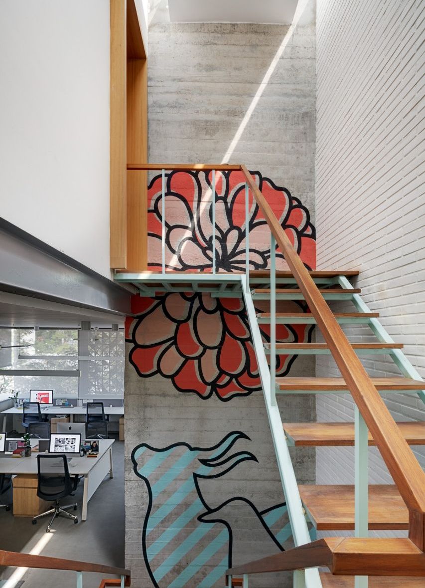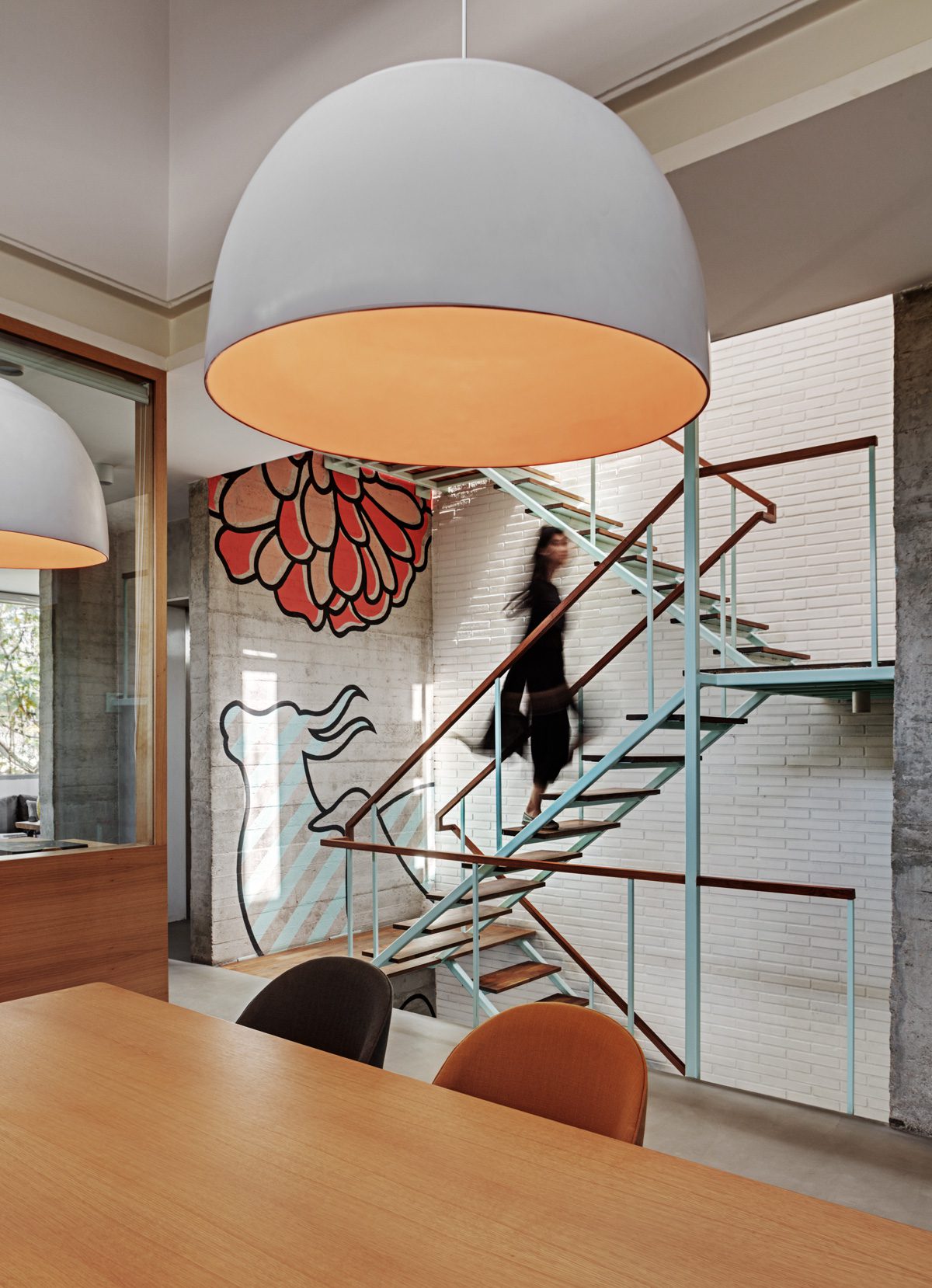 Spaces were carved into the building to foster creativity, and to promote collaboration between the designers. The highlight feature is a lightweight powder blue steel and timber staircase which runs like a vertical spine through the triple height volume of the studio. The dramatic volume is bathed through the day in natural light.