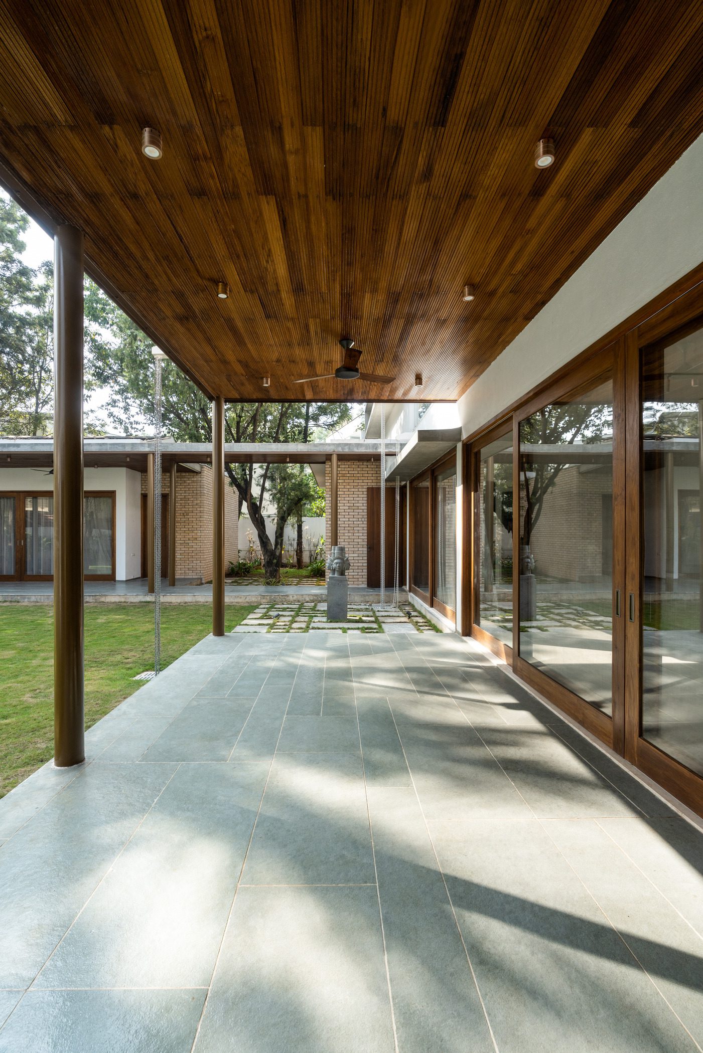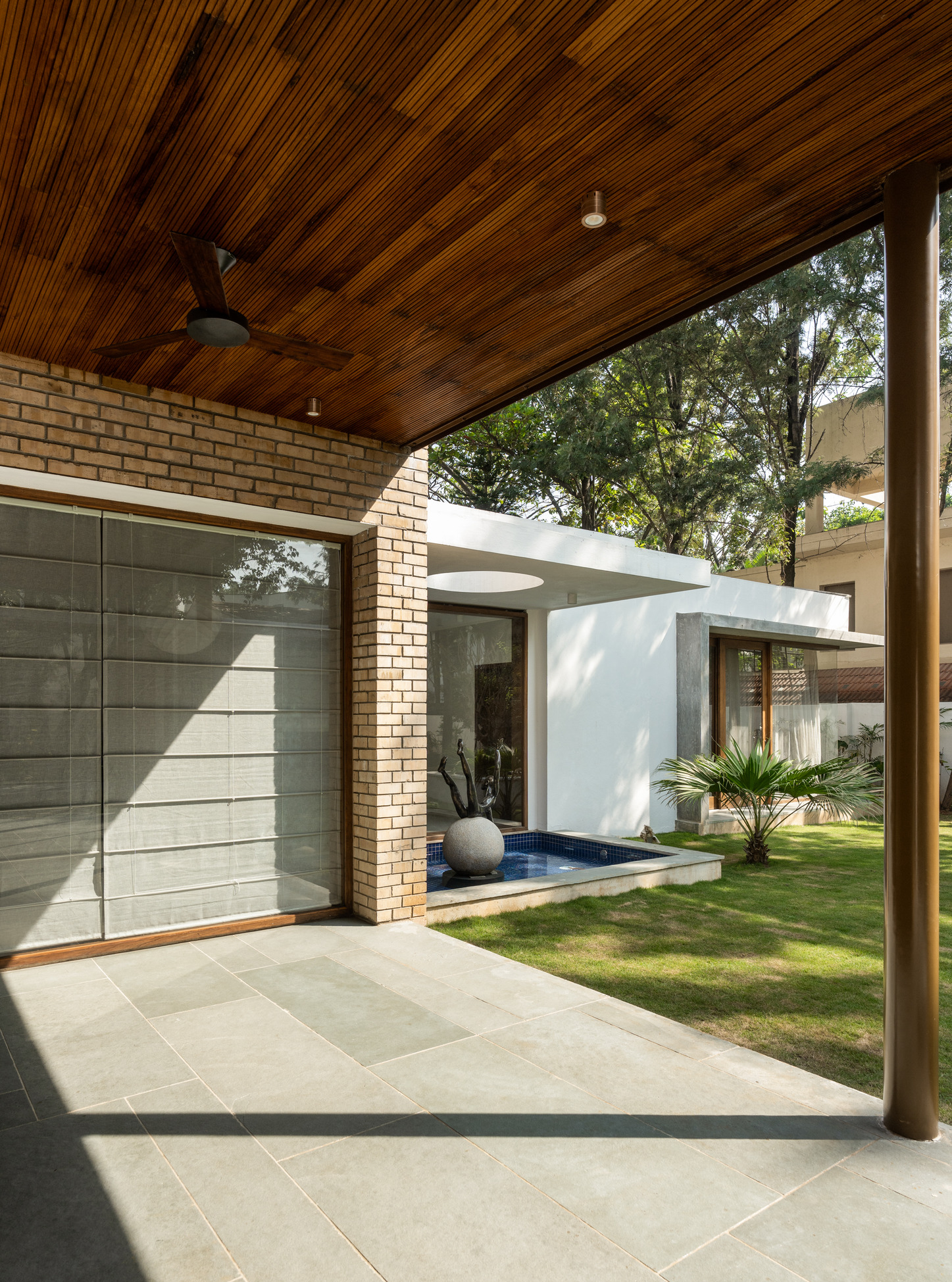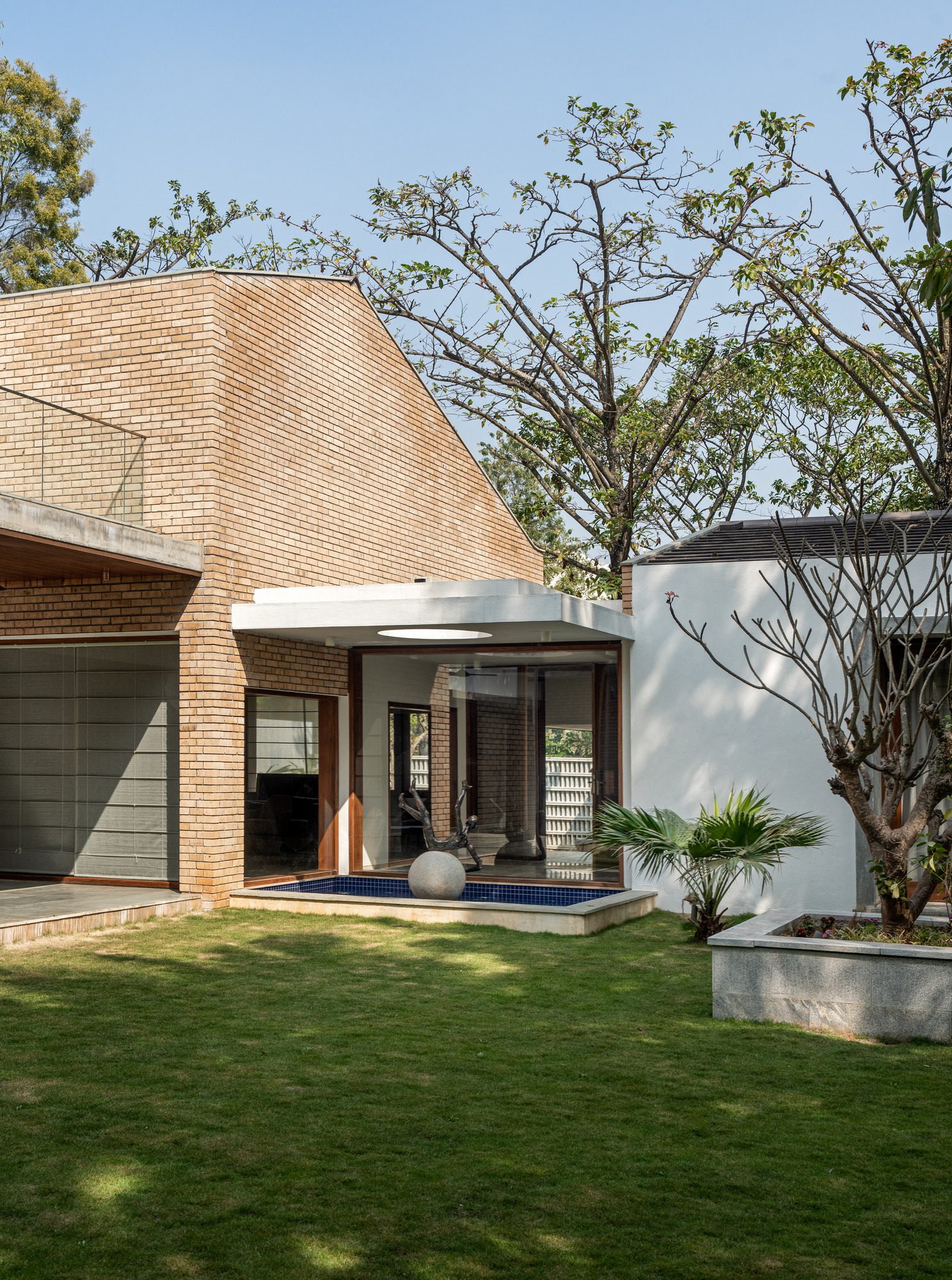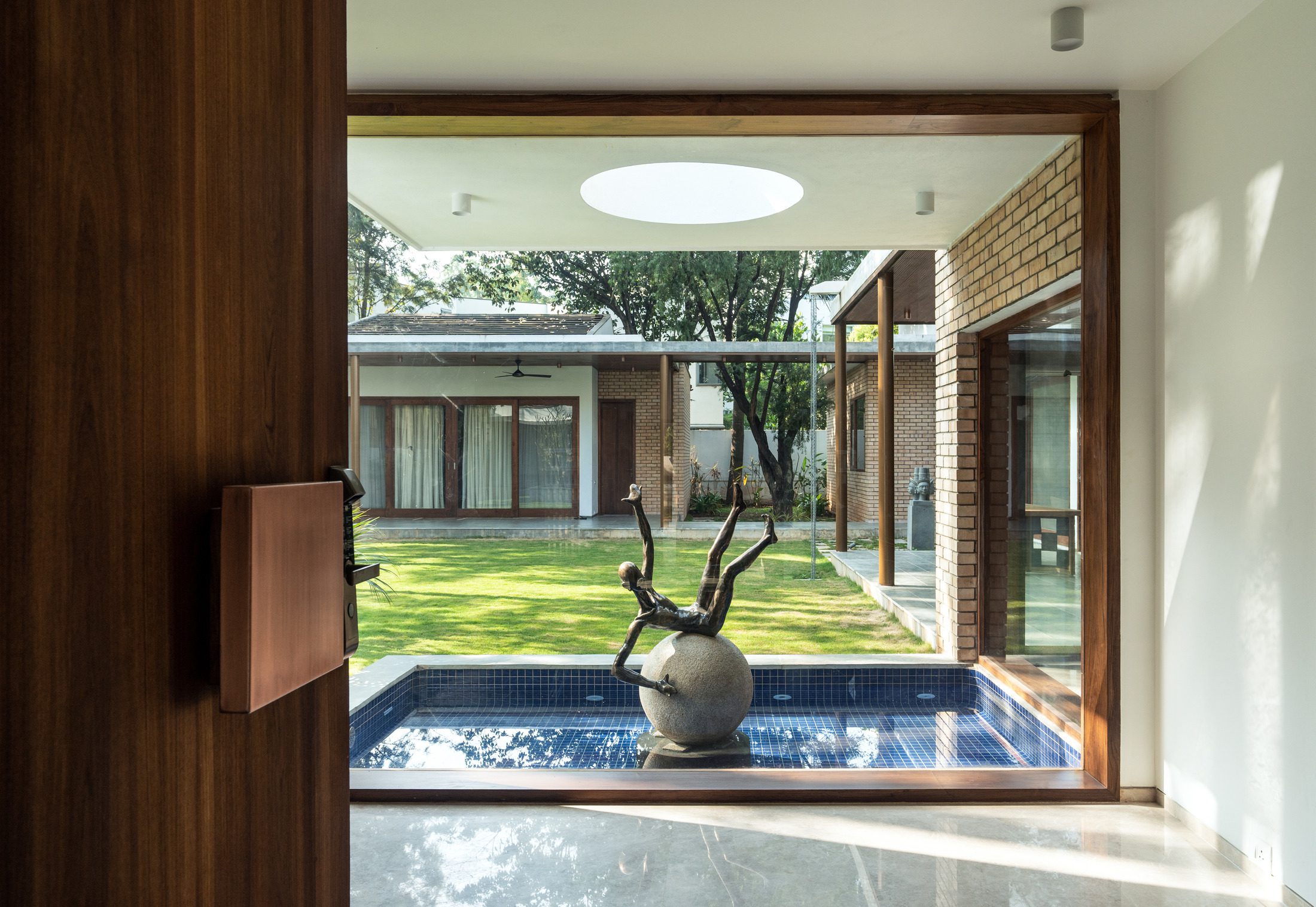 The garden is dotted with sculpture as well as existing trees, strategically placed at certain focal points. As one enters the foyer, you are greeted by a Dimpy Menon bronze sculpture precariously and energetically balancing on a stone sphere. The human sculpture seemingly floats atop a water feature and is bathed in light from a circular skylight atop it. At the southern end of the property, an imposing Willow tree is accommodated in the building design, creating a side court and reinforcing the omnipresent green around the site.