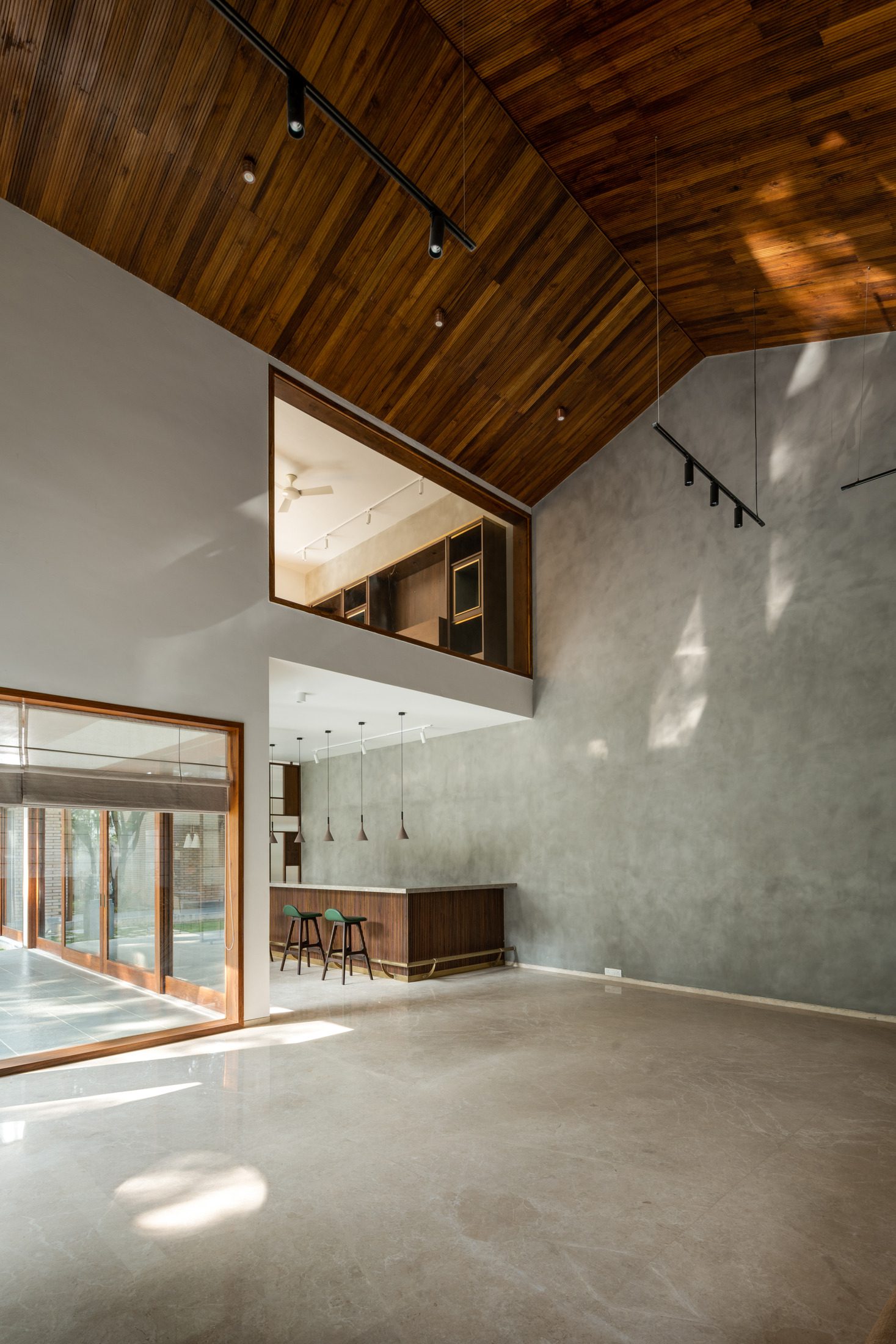 Certain areas like the living, family room, guest bedroom and AV room have pitched sloped roofs while the rest are flat. The materiality is an interplay between brick and plastered white walls, river finished Kota and beige marble floors, timber clad and polished cement ceilings.