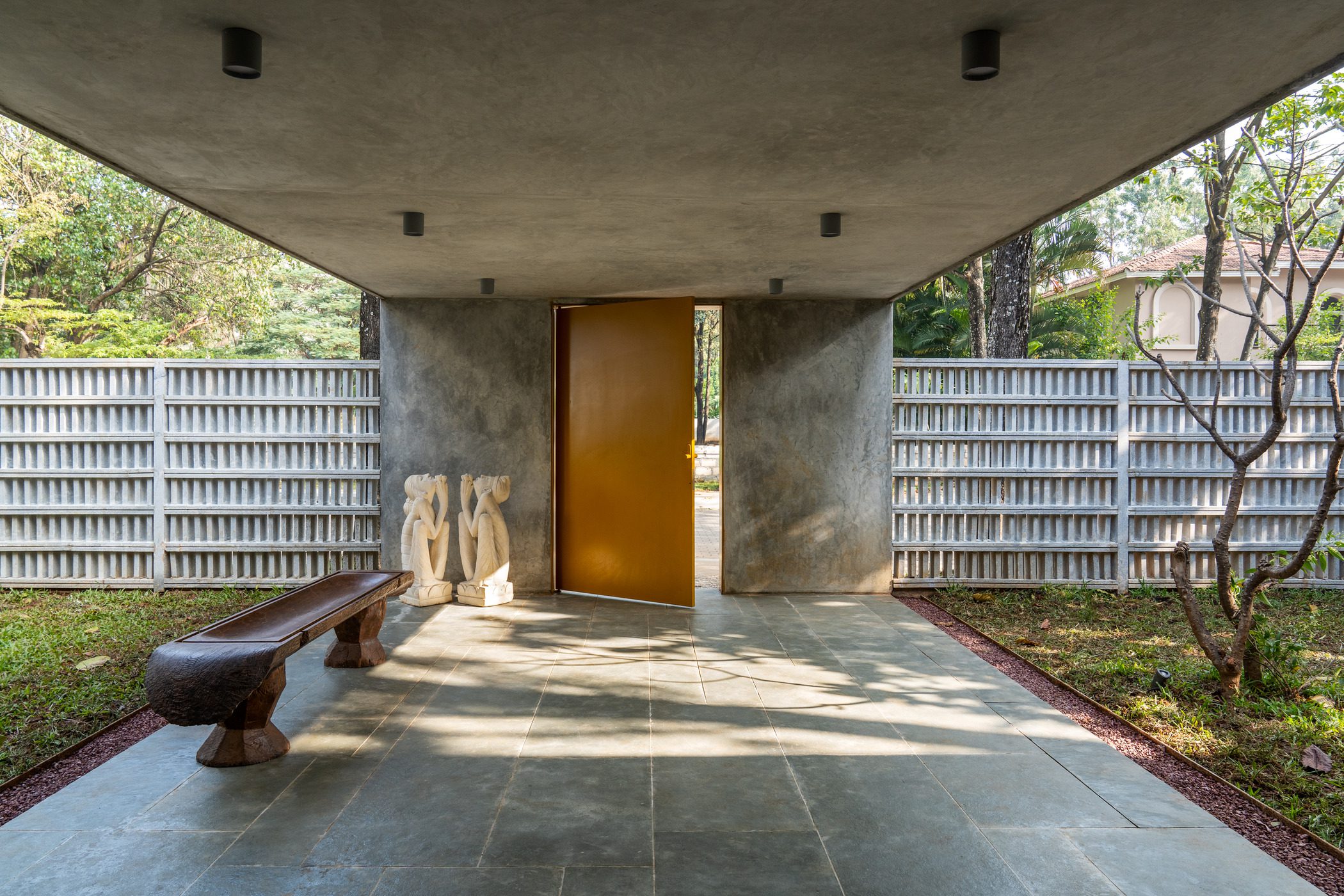 We were keen on a vocabulary of natural materials and an architectural expression that would gently step up from the street. The 100 ft long north boundary wall takes the form of a stone Jaali, crafted entirely out of local Sadharhalli stone by skilled masons. It is a contemporary reference to the liberal use of this stone as means of securing land in rural Karnataka. The repetitive vertical pieces of stone interlock into horizontal bands with tongue and groove joinery and an absence of mortar, referencing the age-old traditional techniques of stone building in the region. A central entrance portal with a yellow door and polished cement surround punctuates the Jaali and guides one into an entrance court and then to the main door.