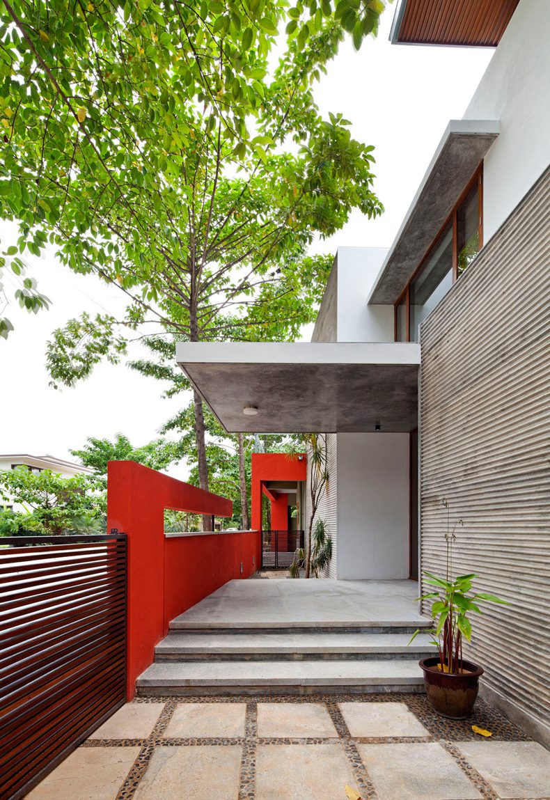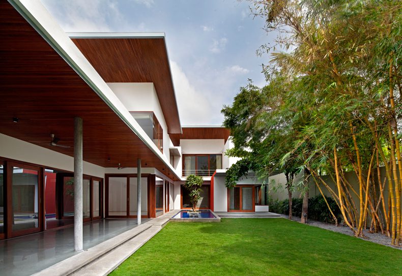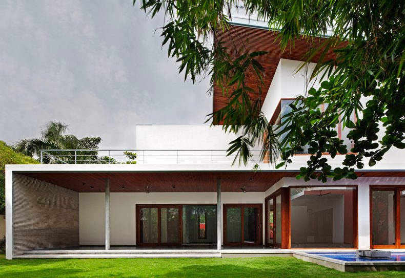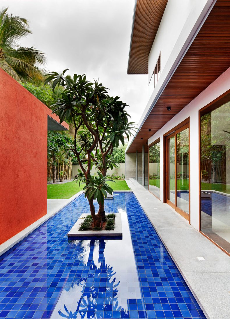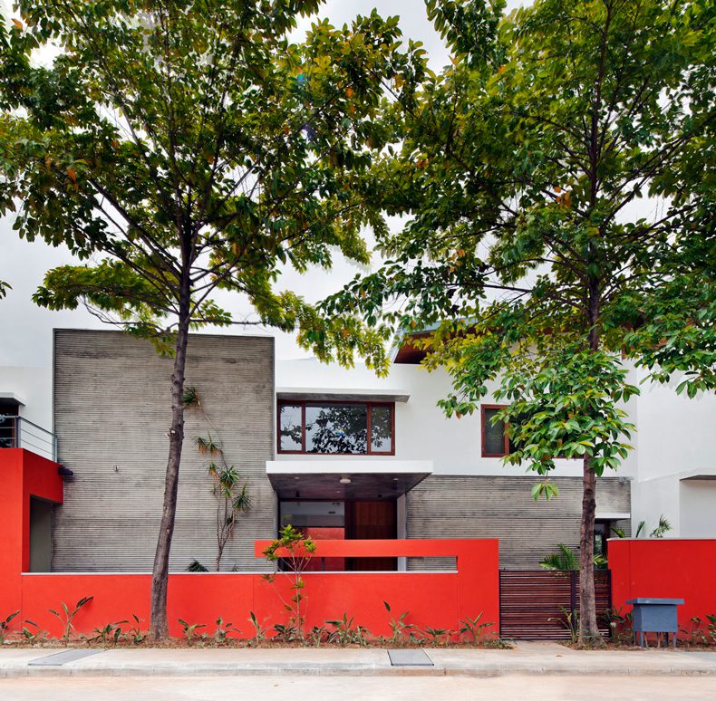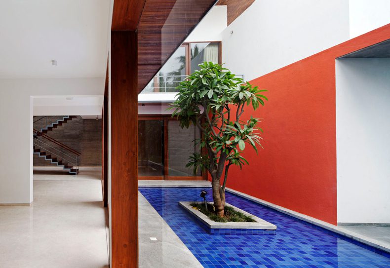 Entry to the house is via a sculpted brick coloured wall and into a foyer that frames a temple tree afloat a linear blue water body. A linear succession of spaces unfolds to the east of the foyer, spatially flowing into one another and finally culminating into a long verandah that overlooks the north garden and bamboo grove.