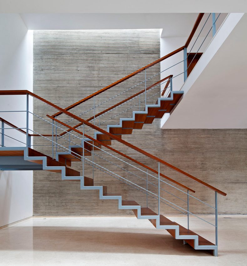 West of the foyer is a generous sky- lit double height volume with a mild steel and timber staircase floating gently within its surrounding volume.